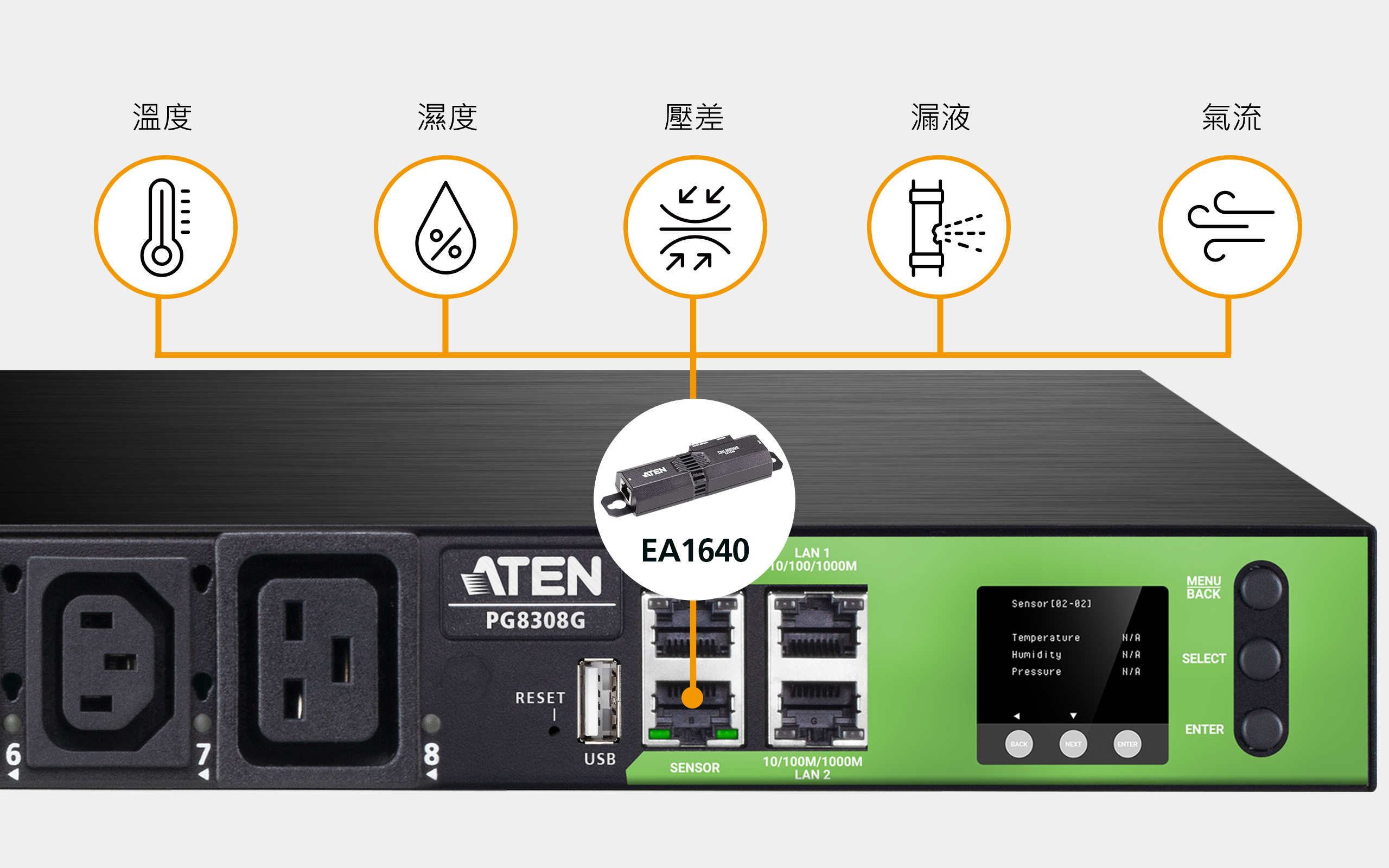 - 環境感測器可透過RJ-45連接埠連接或菊鏈串接高達8個ATEN EA1640環境感測器,供使用者監控溫度、溼度、氣流、氣壓與漏液,具備潛在威脅警示功能 (需自行選購)