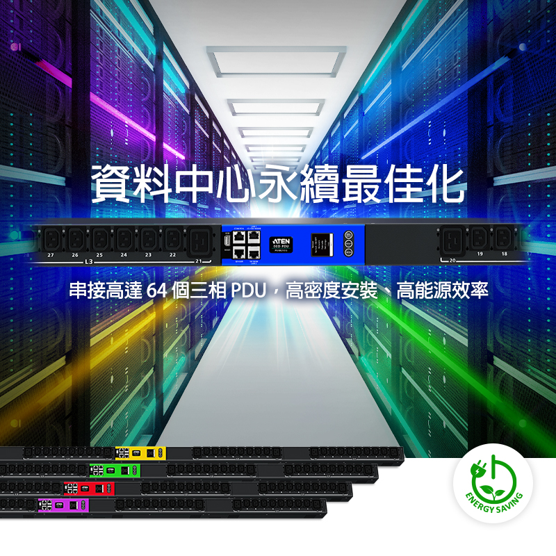 永續能源效率,可讓資料中心或伺服器機房維運變得很不一樣!想要執行有效的電源管理,需要同時提升硬體與軟體。三相電源,能有效傳送及分配電力,因此市場需求增加。ATEN推出全新的PDU-PG系列,採用IEC 插座、0U機架設計,滿足伺服器機房及資料中心高密度 IT 設備不斷增加的電源需求。PG98230 PDU,使用ARM Cortex A8處理器,搭載30個插座,能夠在更高的電壓運作。插入電源,10秒內即可為所有連接的設備供電,提供最精確的 kWh 值 (+/ -1%),獲取較好的能耗與基準,同時主動追蹤。PG98230,以節能為訴求,滿足網路基礎建設的要求,同時降低高達70.65公斤二氧化碳排放 (相當於 131.4 kw能耗),降低電費並減少碳稅。