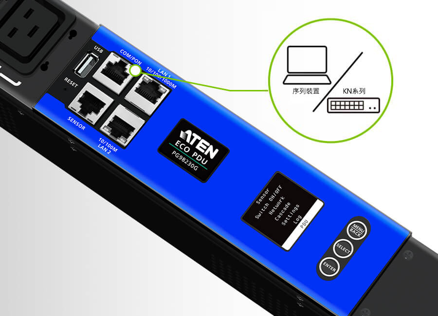 為了方便作業,可從PDU的COM埠連接序列裝置,再透過CLI指令進行通訊。COM埠也具有PON功能,經由乙太網路連線至1台 KN 系列 KVM over IP 切換器,集中管理16個 (最多) 菊鏈串接的PDU 電源分配器。