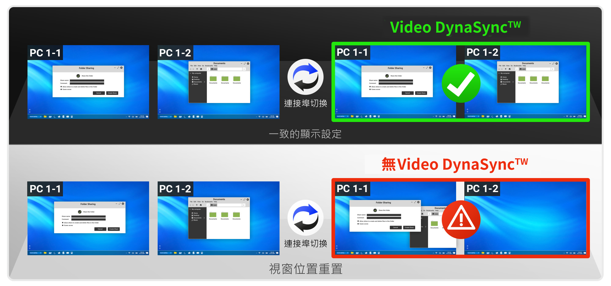 CS742H 內建 ATEN 獨家 Video DynaSync™ 技術,可優化顯示解析度;每次切換連接埠,仍維持一致的視窗大小與圖示位置,避免因重新讀取 EDID 而有閃爍或跑版。
