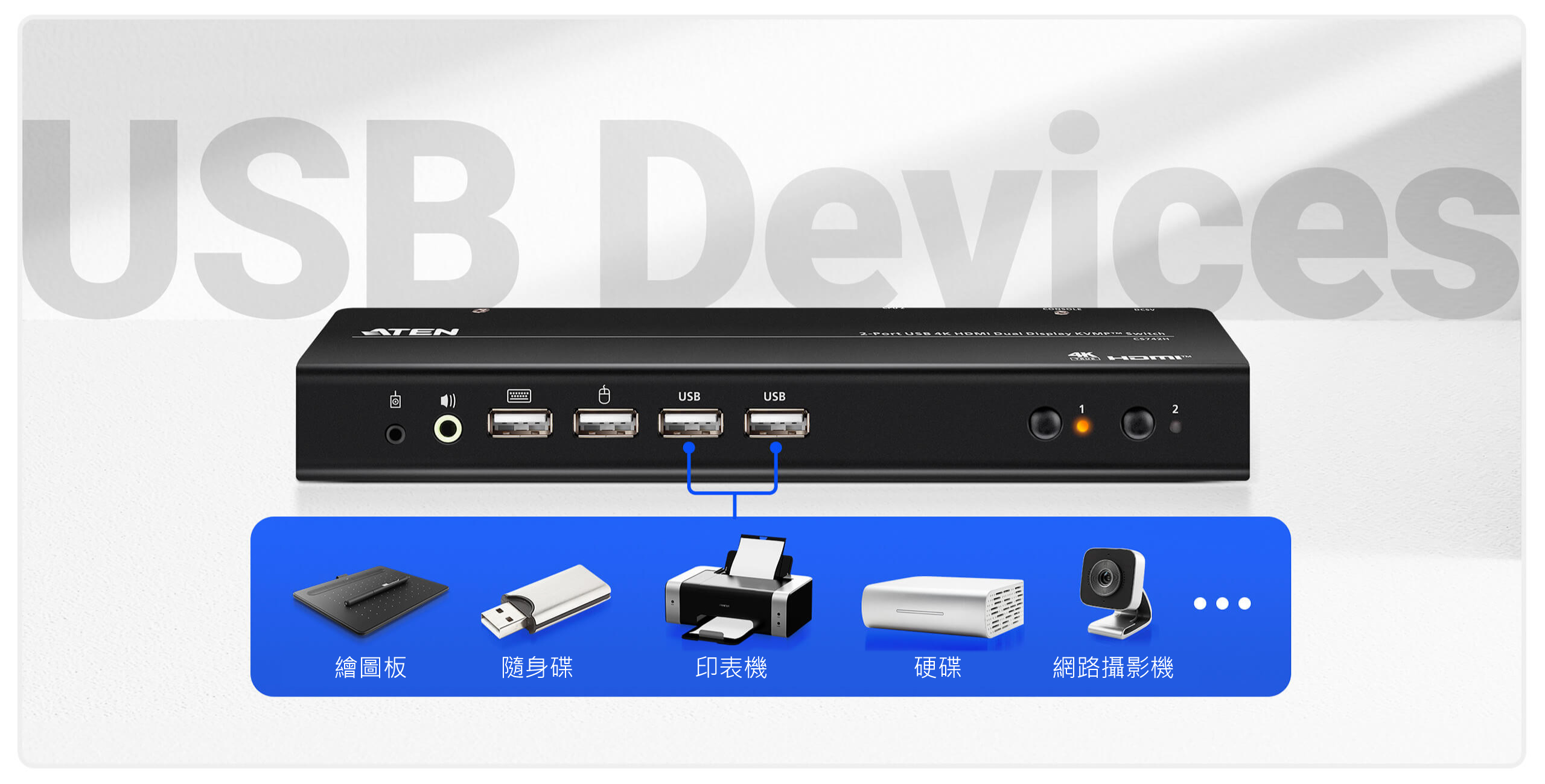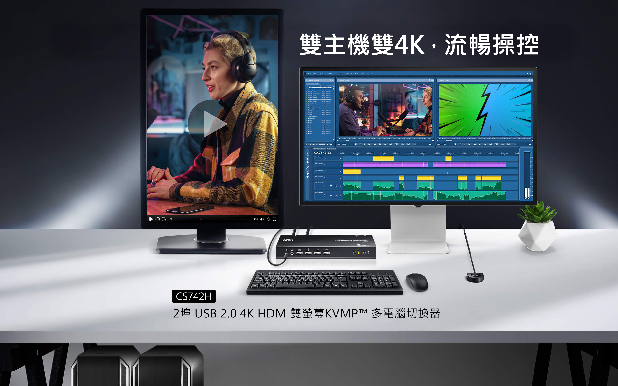 ATEN CS742H 2 埠 KVM 切換器,專為 2 台電腦、雙螢幕的多工任務而設計。你只需要一組鍵盤與滑鼠,就能維持桌面清爽,同時輕鬆掌控 2 台 HDMI 電腦與 2 台 HDMI 螢幕。