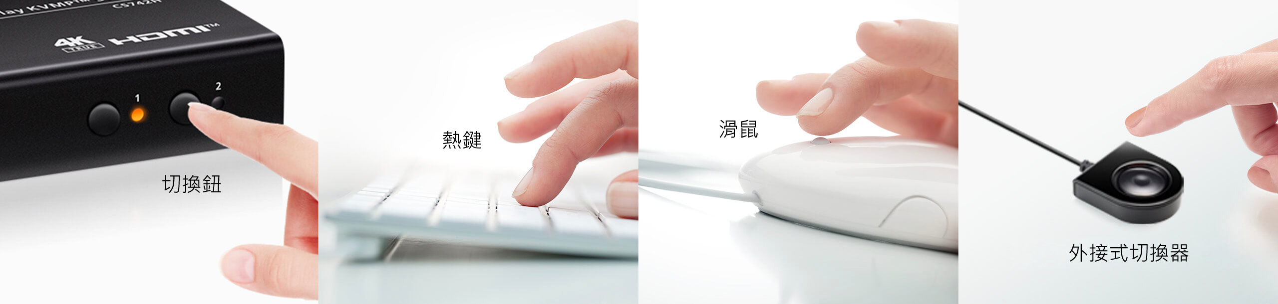 支援面板切換、鍵盤熱鍵、滑鼠與外接式切換按鍵 4 種方式,使用者可依自身工作習慣快速切換控制電腦,操作更加直覺又順手。