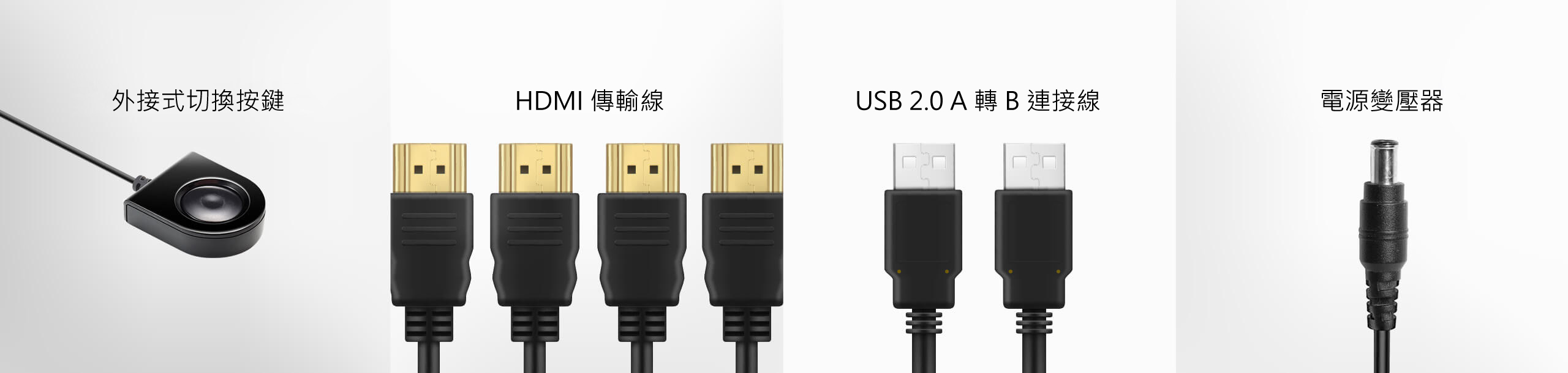 隨附完整的安裝配件,包括 4 條 HDMI 傳輸線、2 條 USB 2.0 A 轉 B 連接線、1 組電源變壓器,以及 1 組外接式切換按鍵。即買即用,快速建置無障礙。