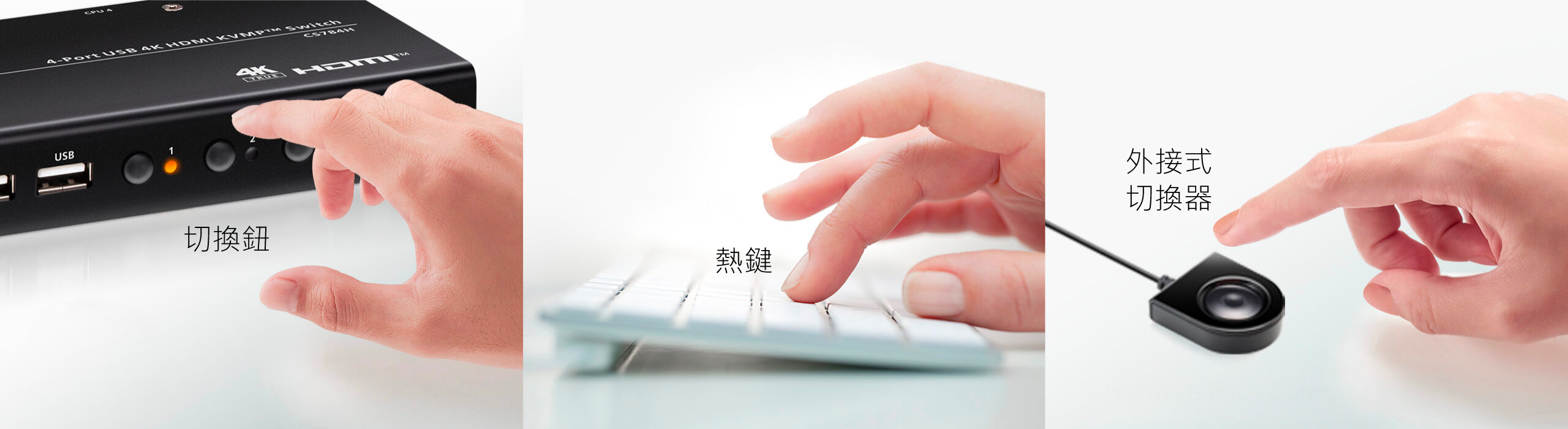 支援面板切換、鍵盤熱鍵與外接式切換按鍵 3 種方式,使用者可依自身工作習慣快速切換控制電腦,操作更加直覺又順手。