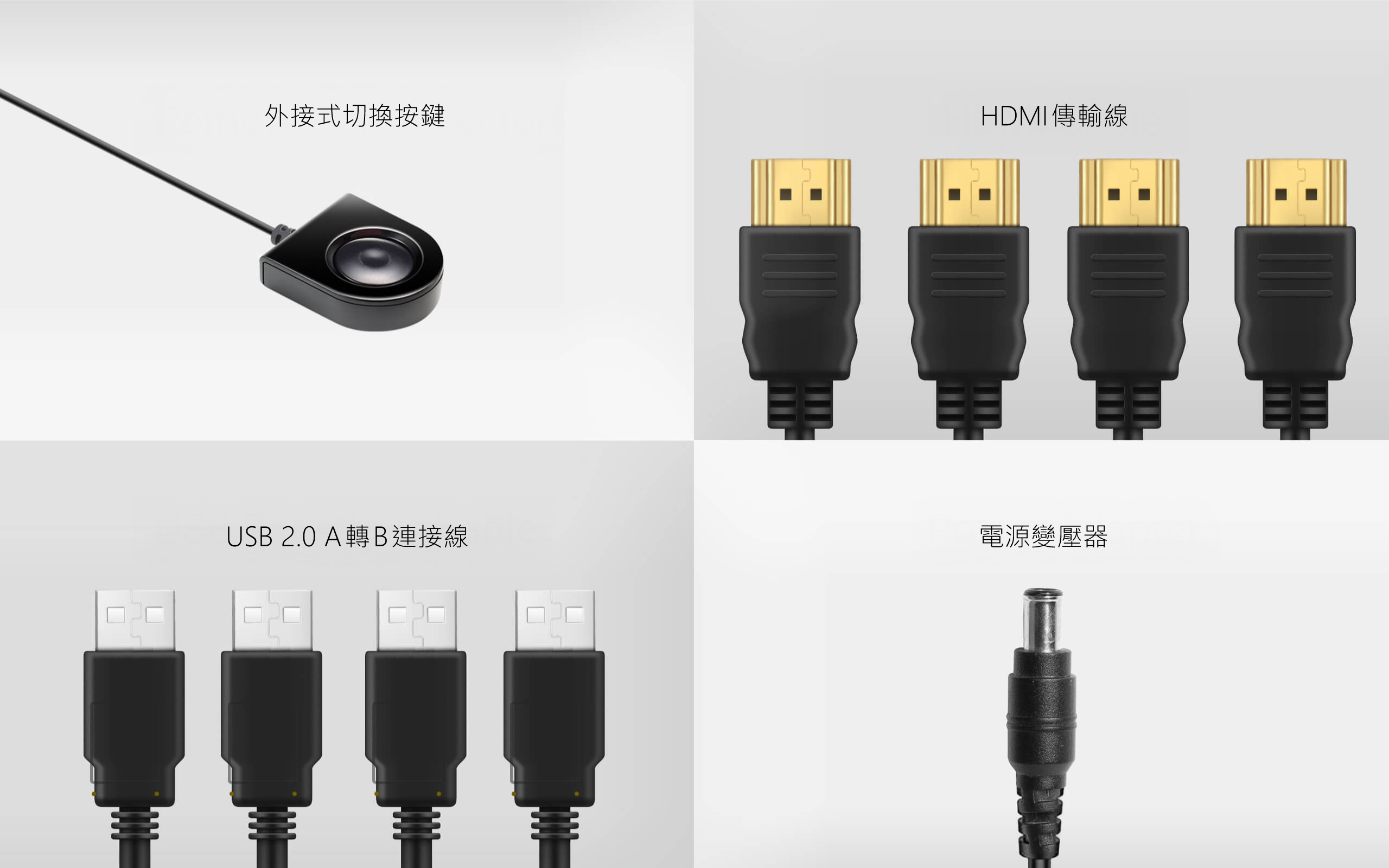 隨附完整的安裝配件,包括 4 條 HDMI 傳輸線、2 條 USB 2.0 A 轉 B 連接線、1 組電源變壓器,以及 1 組外接式切換按鍵。即買即用,快速建置無障礙。