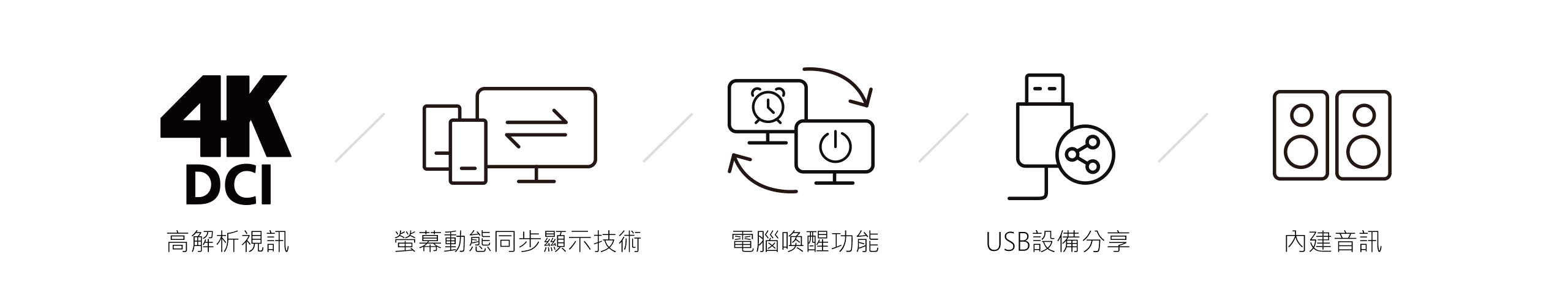 - 影像品質卓越 – 支援最高解析度4096 x 2160 @ 60 Hz和 5120 x 1440 @ 60 Hz