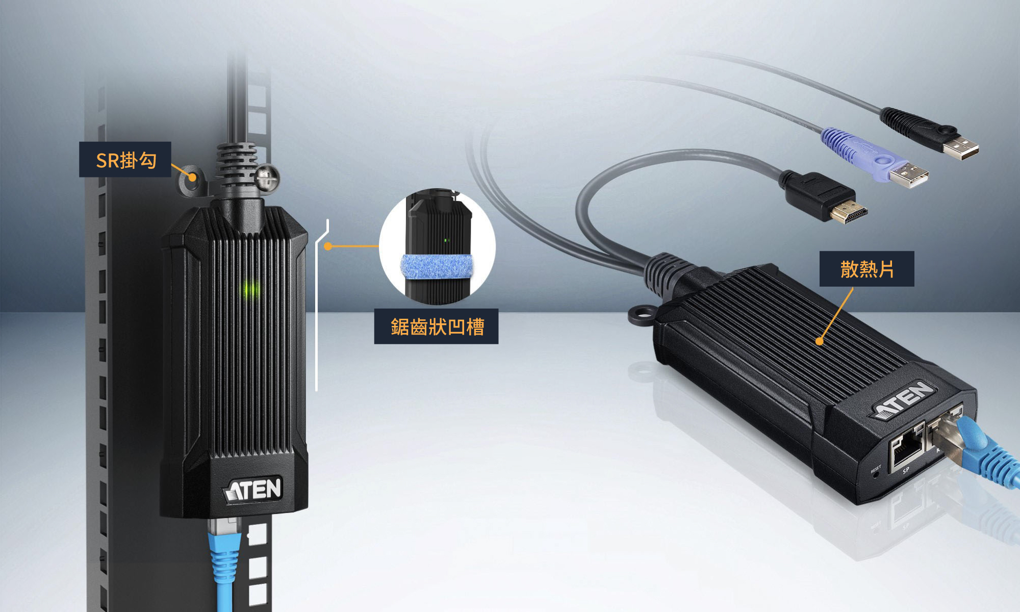 KVM 數位電腦端模組 ,提供 VGA、DVI、HDMI 與 DisplayPort 多種連接方式,使伺服器安裝規劃更加彈性。其 0U 設計比市面上同型產品輕 25% 且體積小了 ¼,徹底優化機櫃空間的安裝效率。防彎曲 SR 掛勾,可彈性且穩固於機架安裝;兩側的鋸齒狀凹槽,可防止固定在機架上因鬆動而掉落。此外,散熱片有助於提升空氣流動效能,確保系統的可靠性。