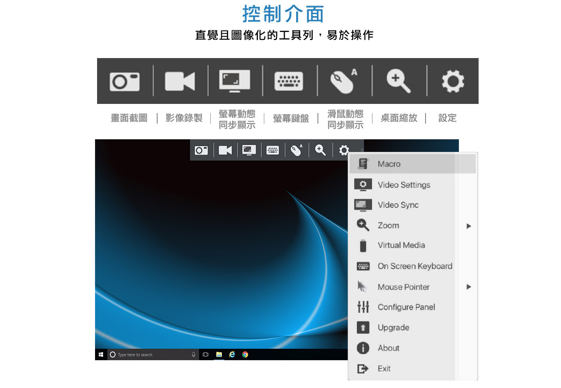 - 使用者可透過被控電腦畫面顯示視窗上方的工具列,只需要透過滑鼠點擊工具列上的圖像化按鍵,即可操作全部功能