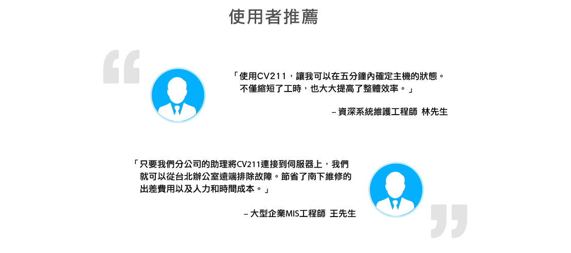 CV211為一款攜帶型KVM控制器。透過CV211連接筆電和伺服器、一般電腦、公共資訊站(kiosk)或ATM自動提款機,這些設備的作業系統視窗畫面便可在筆電的螢幕中顯示。因為CV211使用一條USB 2.0及VGA複合線材連接其它電腦設備,就可讓使用者擁有該設備BIOS層級的存取權限,並且可進行雙向檔案傳輸,透過熱鍵巨集快速執行功能操作,也支援操作畫面的影像錄製和螢幕快照截圖。讓CV211搭配筆電就可以完全取代生產線和機房中用來乘載電腦周邊裝置的笨重推車,提升使用者的工作效率和機動性,非常適合需要隨時隨地都能進行維護系統工作的IT專業人員。