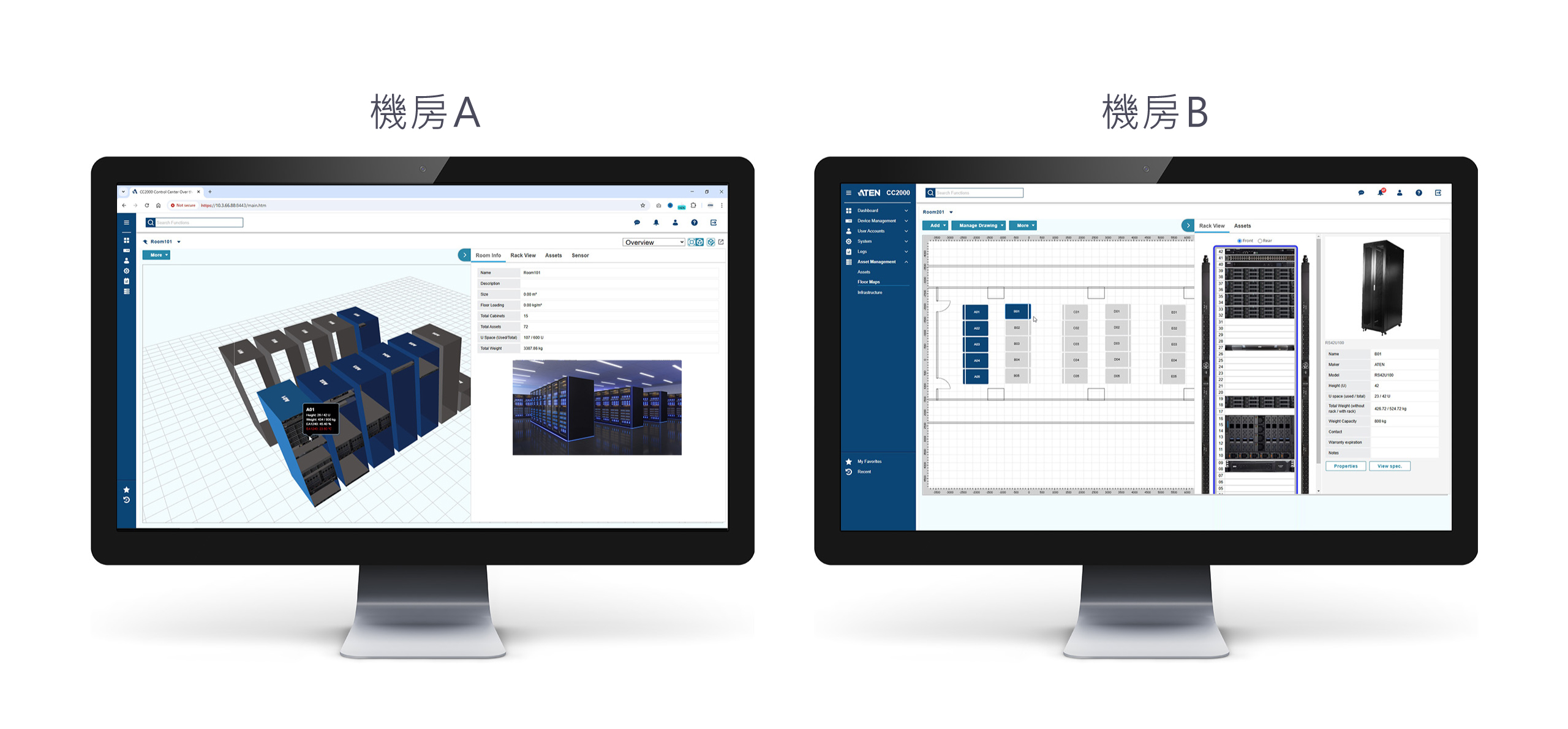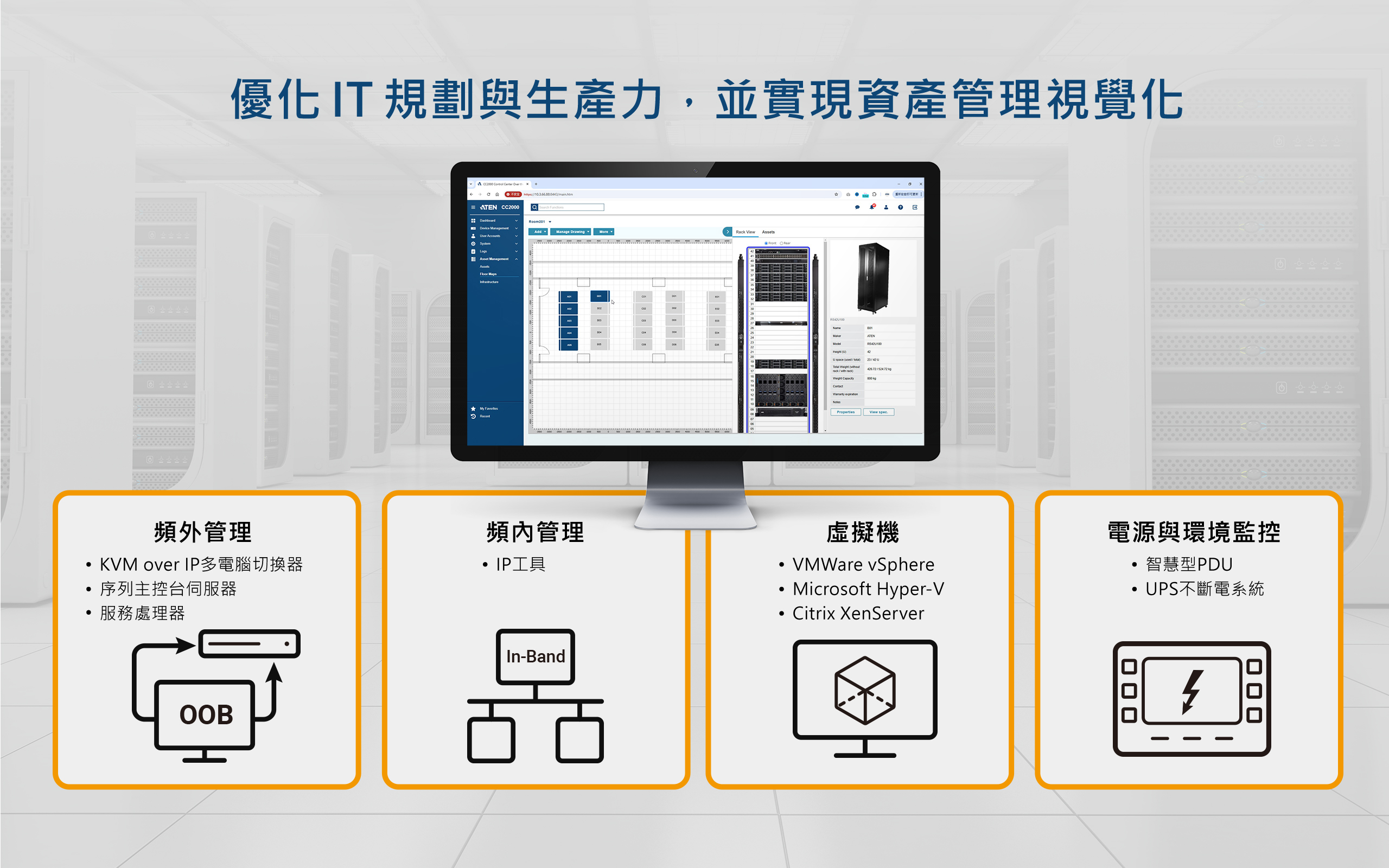 此外,CC2000 也支援進階功能,包括資產管理、環境監控與容量管理,並搭配樓層平面圖,有助於使用者進行資源盤點、配置與調度,確保基礎設施依組織需求被有效使用。