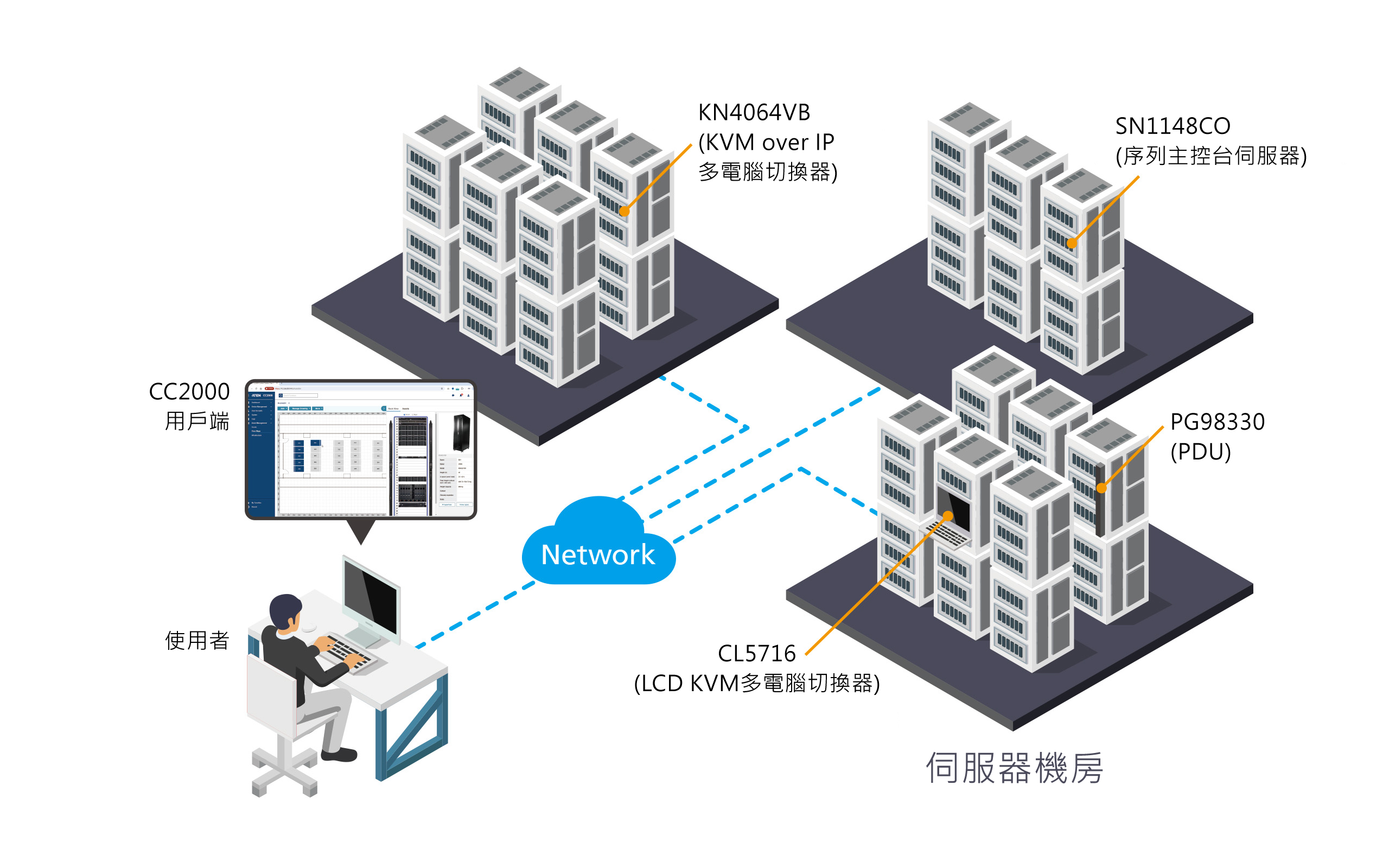 CC2000管理軟體,是ATEN專為各產業之IT管理團隊所設計的全方位集中式管理解決方案。透過登入單一入口,管理者即可於本地端或遠端管理IT基礎設施。CC2000同時具備頻內及頻外存取功能,方便使用者管理網路架構內所有的IT 設備,包括ATEN 的KVM over IP 多電腦切換器、序列控制端伺服器、PDU電源分配器、UPS不斷電系統、以及其他第三方設備,例如嵌入式服務處理器(embedded Service Processor)、刀鋒伺服器、服務處理器、與虛擬伺服器。全新改版的CC2000支援HTML5使用者介面,打造了更流暢、直覺易用的操作體驗,大幅提升管理效率。