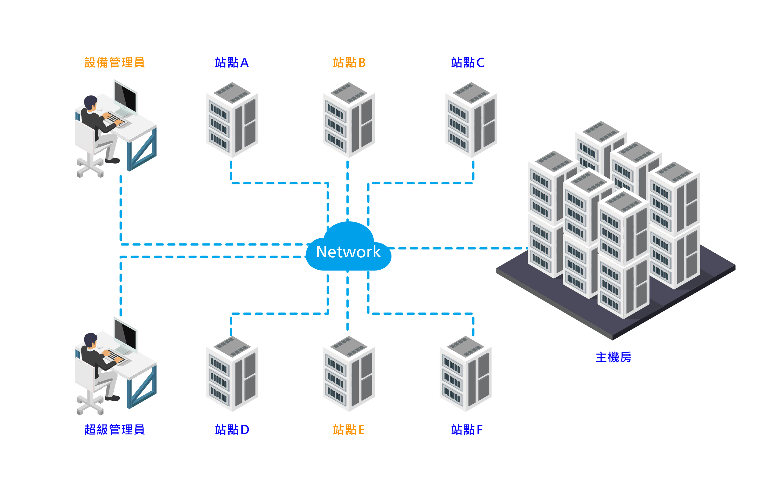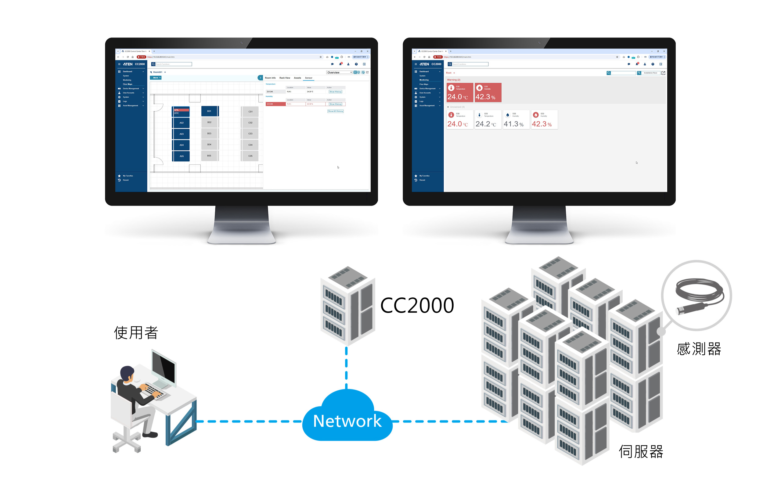 - 環境及電源控管 – 監控伺服器機房和資料中心的溫度、濕度、氣壓、電壓、電流、功耗、漏水和門禁