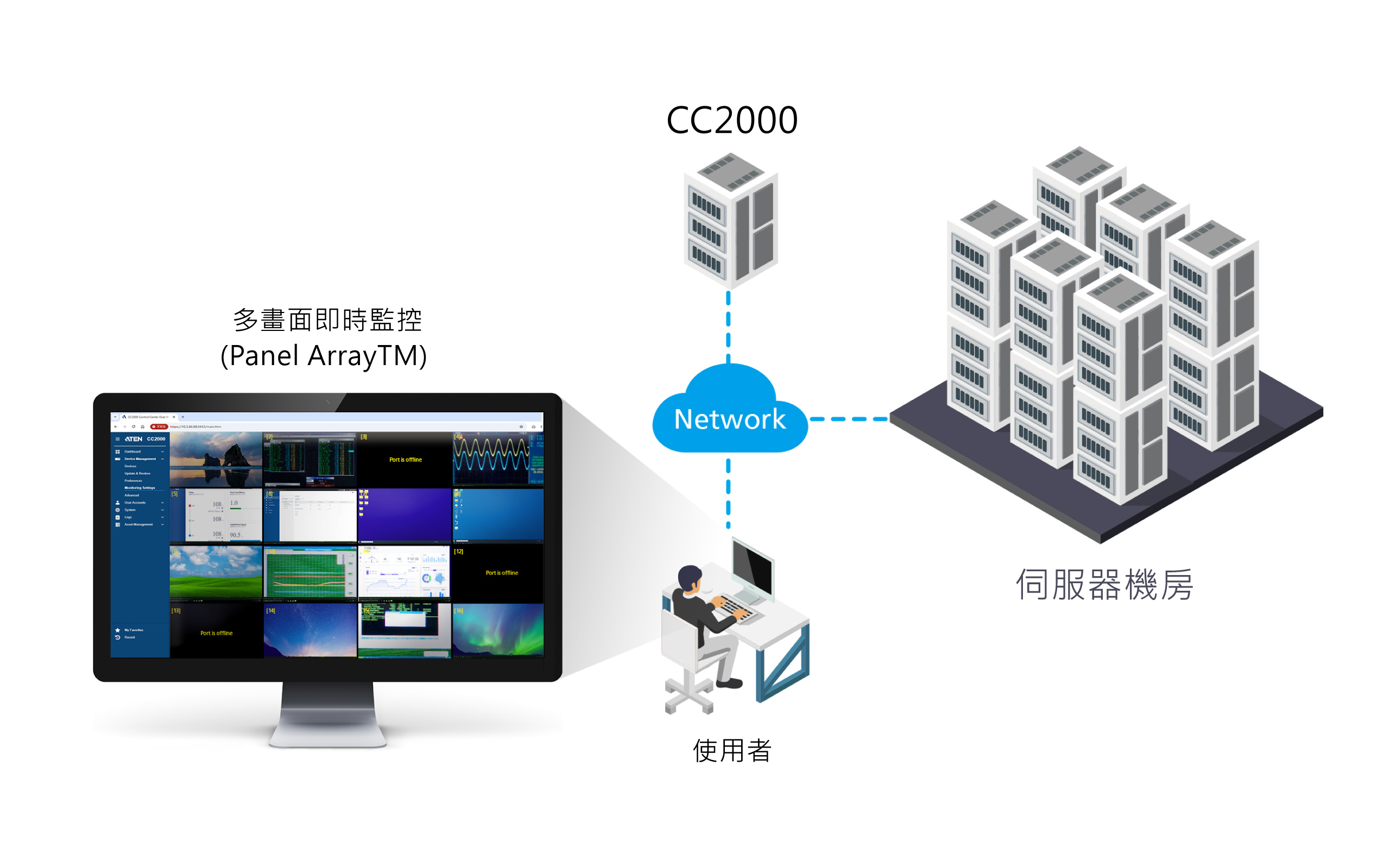 CC2000 可透過單一平台集中管理各類 IT 設備,包含 ATEN KVM over IP 多電腦切換器、序列主控台伺服器、智慧型 PDU、UPS、不斷電系統、服務處理器、刀鋒伺服器、虛擬伺服器等。內建的 Dashboard,提供單一入口即可查看關鍵資訊與監控任務,例如設備狀態、事件、任務結果、線上使用者、授權節點使用狀況及系統紀錄等;此外,提供告警通知功能,有助於管理者即時掌握並快速處理重要事件。