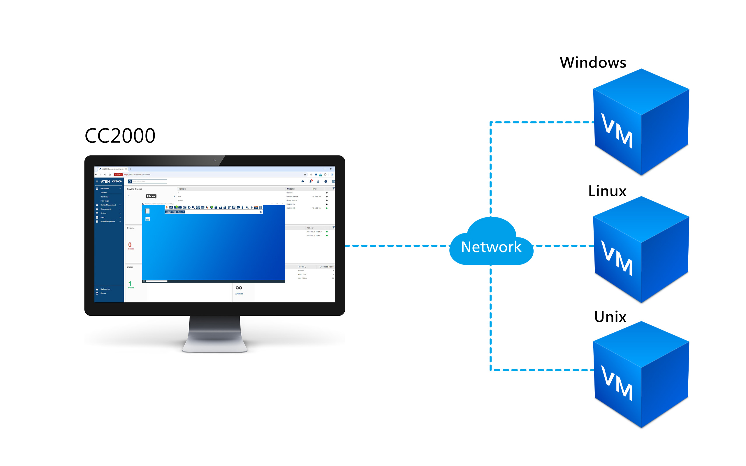 使用者在 VMware 平台上新增虛擬主機 (例如 vSphere v6.0 / 6.5 / 6.7 / 7.0 / 8.0、Windows Server 2008 / 2012 / 2016 或 Citrix XenServer v6.5),可以透過 CC2000 管理虛擬化環境的存取與控制,也可以在遠端執行軟體部署 (包括安裝 ISO 影像、開機、升級設備與診斷測試等,就像在本地操作般的體驗。