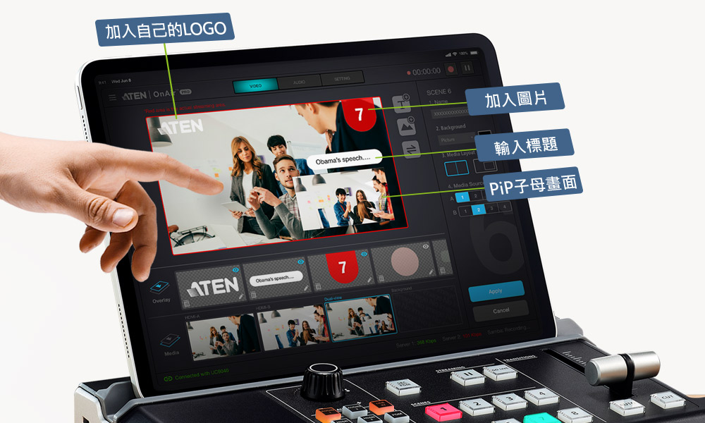 - 直覺式介面設計的OnAir app – 可預設多達8個場景,透過自訂的視訊配置、預覽及全螢幕的監控、即時編輯及轉場設定;內建搶眼的數位轉場特效 (DVE)、子母畫面設置(PiP或PbP) 視覺效果,同時疊加圖像及文字,提供功能齊全的專業特效