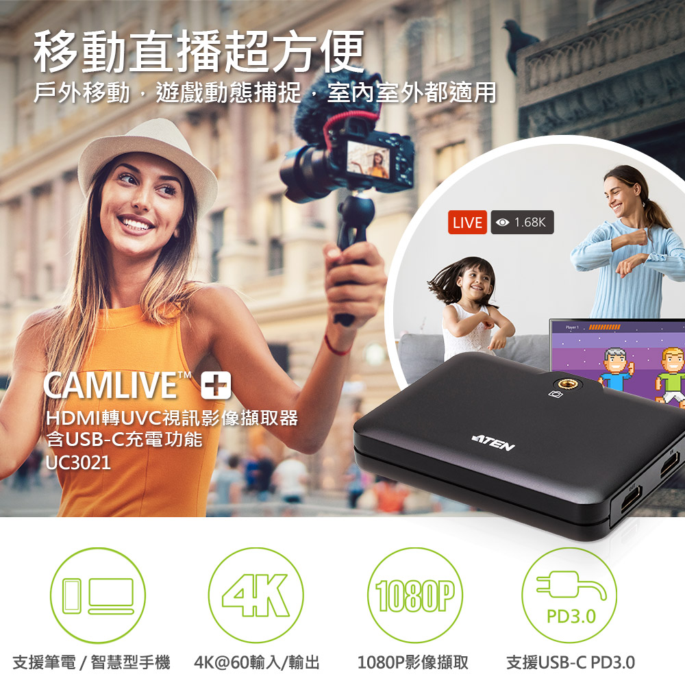 - 1x CAMLIVE™+ HDMI 轉 UVC 視訊影像擷取器含USB-C充電功能