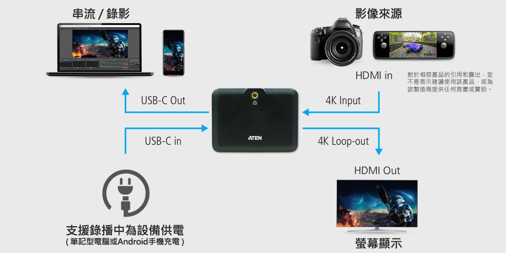 *需透過HDMI轉接器,輸出影像至 ATEN CamLIVE™ (HDMI轉USB-C UVC視訊影像擷取器) 和 StreamLIVE™ (多功能直播機)。