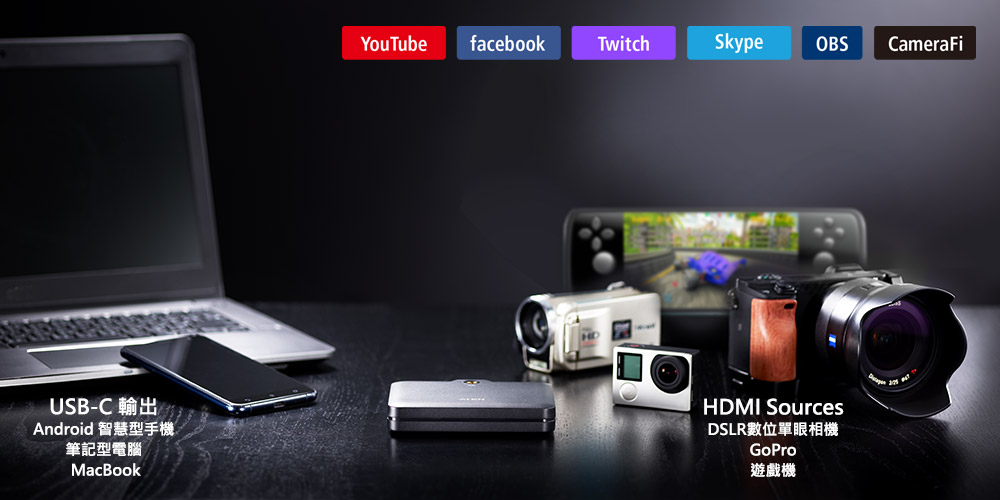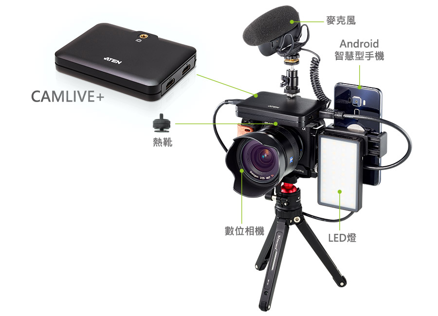 CAMLIVE™ + 具有輕巧美觀的設計,無論活動在室內或戶外,都可以為您提供高品質的即時直播串流或直覺的視訊影像編輯體驗。