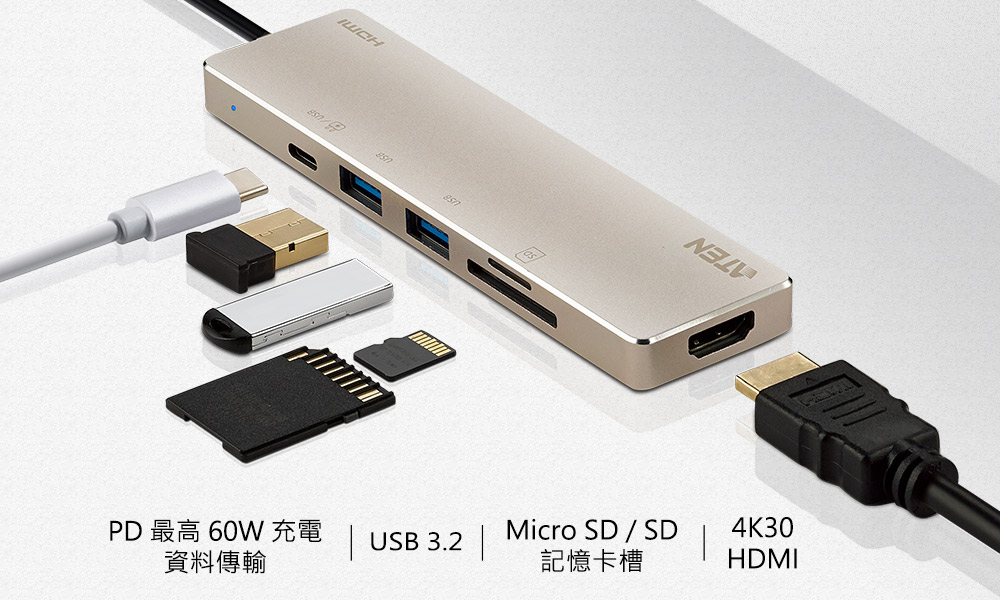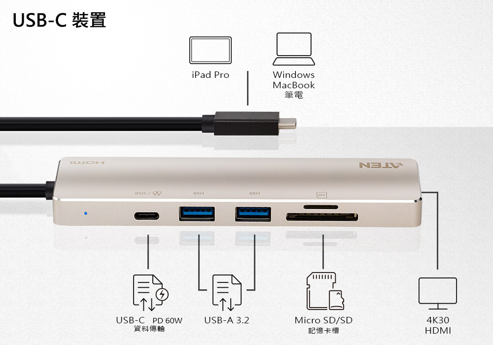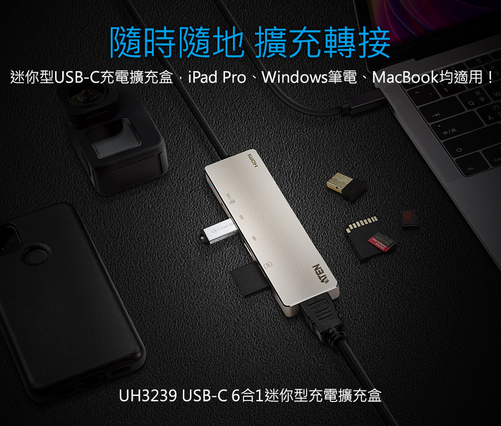 ATEN UH3239 既時尚又輕巧、體積小但功能強大:在小小的裝置裡,內建所有你可能需要的周邊裝置介面,隨時隨地為iPad Pro或筆電的USB-C埠擴充連接其它設備。