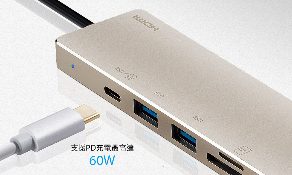 UH3239 USB-C 6合1迷你型充電擴充盒含六種連接埠,具高度便攜性和連接設備擴充性,適合與USB-C介面的筆電或平板搭配使用,優化使用彈性。耐用的鋁製外殼搭載兩個USB 3.2 Type-A連接埠、一個USB-C PD連接埠、一個HDMI連接埠、一個SD卡槽、與一個MicroSD卡槽 ,可在串接週邊設備的同時,對USB-C主機進行供電。UH3239支援高達4K (3840 x 2160) @ 30 Hz HDMI訊源解析度,創造擬真且細緻的影像觀賞體驗。此外,兩個USB 3.2 Type-A連接埠傳輸速度最高可達5 Gbps。USB-C PD連接埠可供電給外接設備,一掃桌面充滿凌亂線材的煩惱,讓使用者的桌面更簡潔。