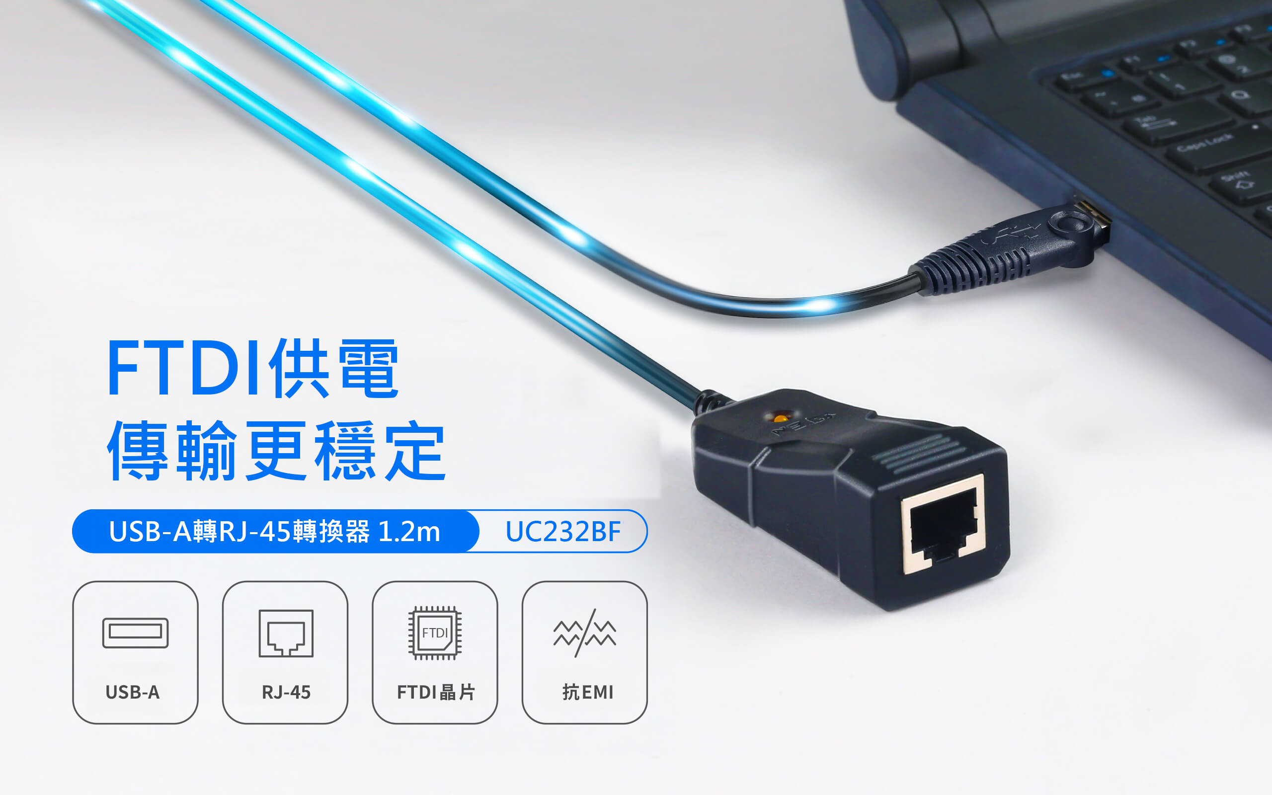 UC232BF 具備 USB 2.0 傳輸效能與堅固的線材,提供可靠的抗 EMI 能力,資料傳輸速率最高可達 921.6 Kbps。