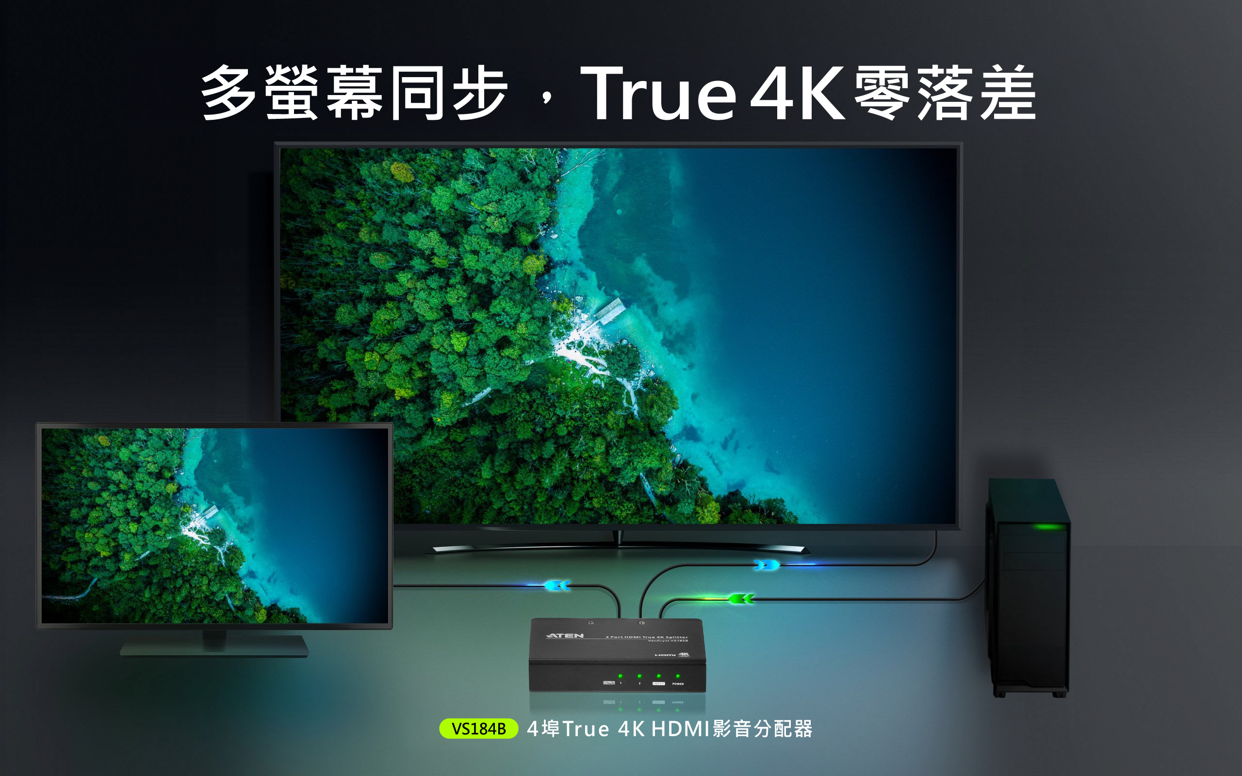 VS184B True 4K HDMI 影音分配器相容於HDMI 2.0、可達True 4K 解析度 (4K @60 Hz (4:4:4)),且支援多重串流音訊,可與設置於家庭劇院的HDMI 顯示設備完美搭配使用,同時也適用於企業、教育機構、及其他商業環境。