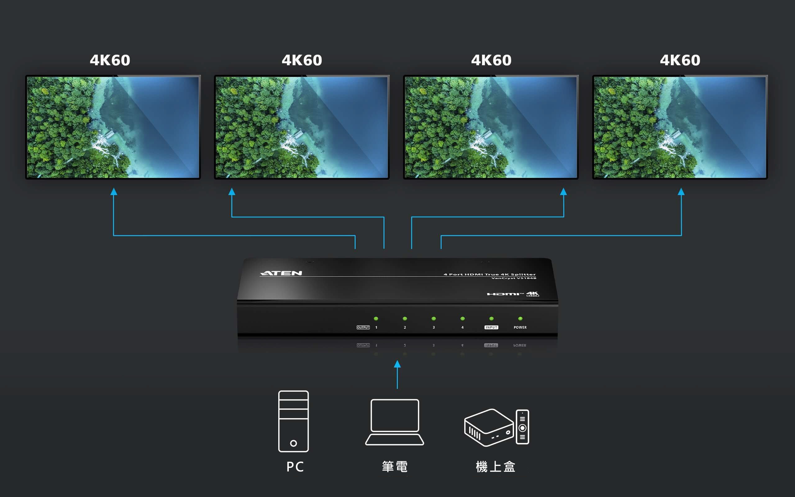 可連接 PC、筆電、多媒體播放器等 HDMI 裝置,將影音同時傳送到四台顯示器,無論家用與商用皆宜。