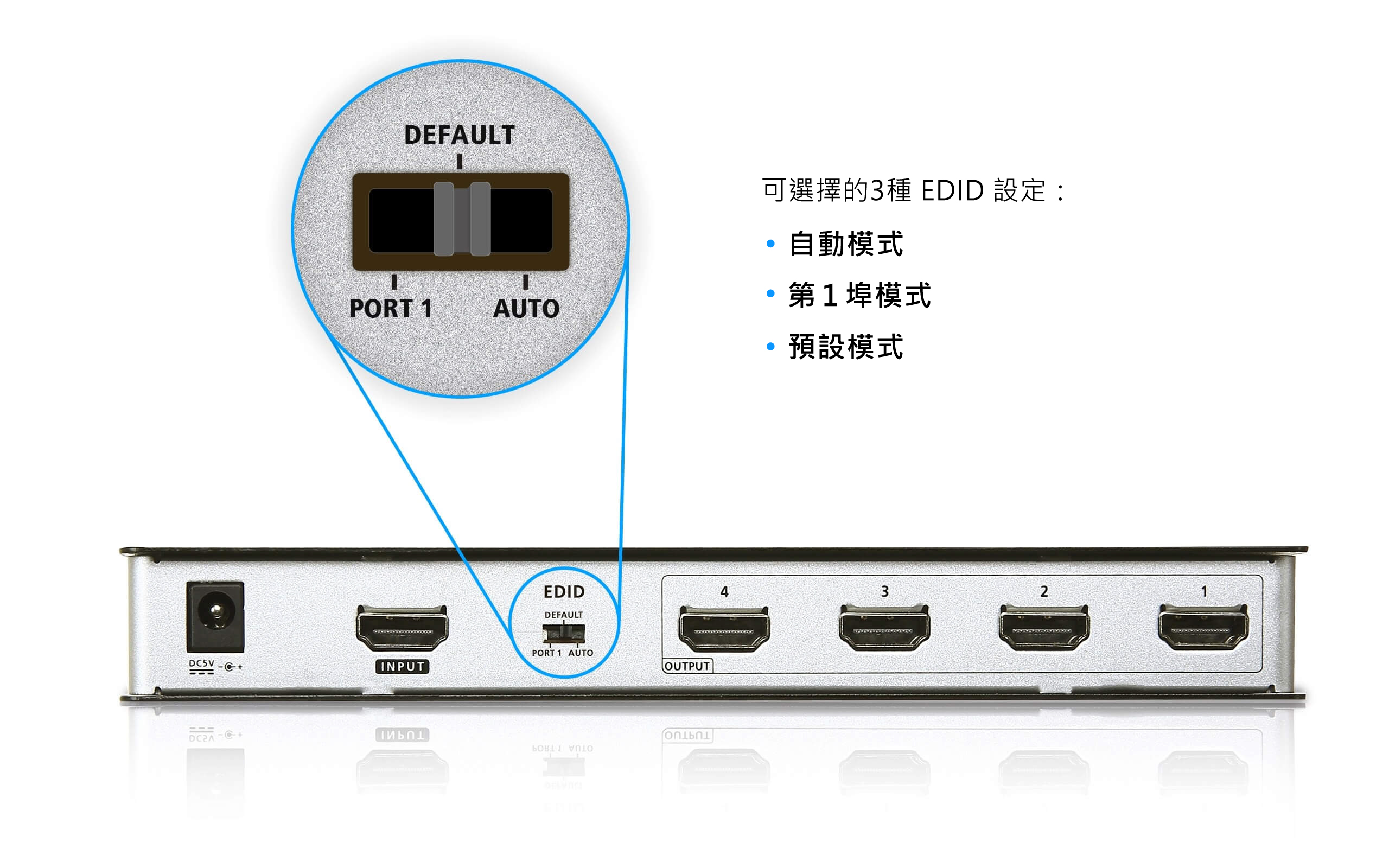 - EDID Expert ™ – 可選擇EDID 設定模式,能確保在不同螢幕間依然擁有最佳解析度並提供優質畫面顯示。透過EDID指撥開關讓使用者輕鬆的切換Port 1、Default 與Auto