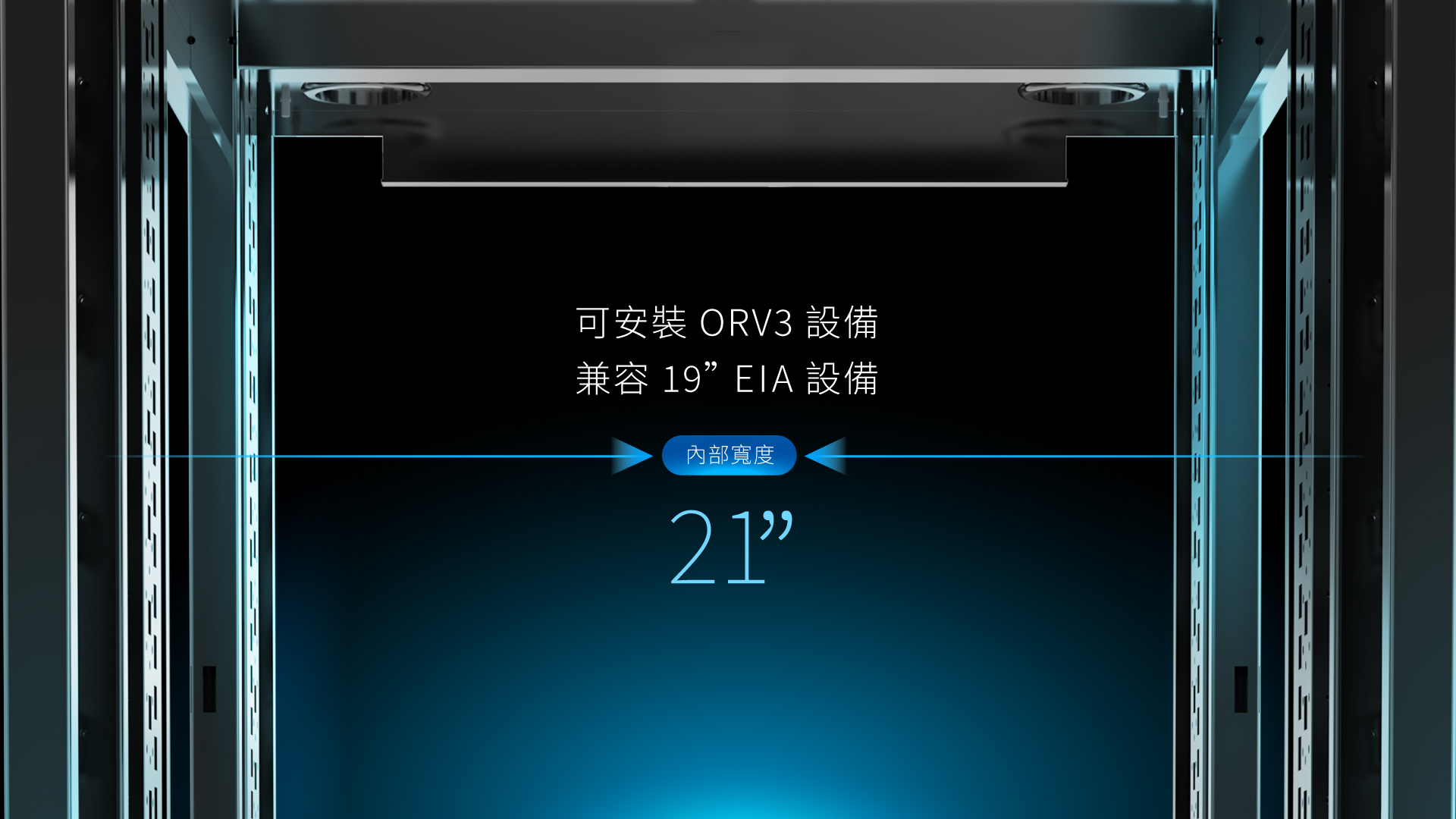 • 支援安裝48V Bus Bar匯流排和 Power Shelf 電源模組,為ORV3設備 (如伺服器、網路與儲存設備) 提供穩定供電