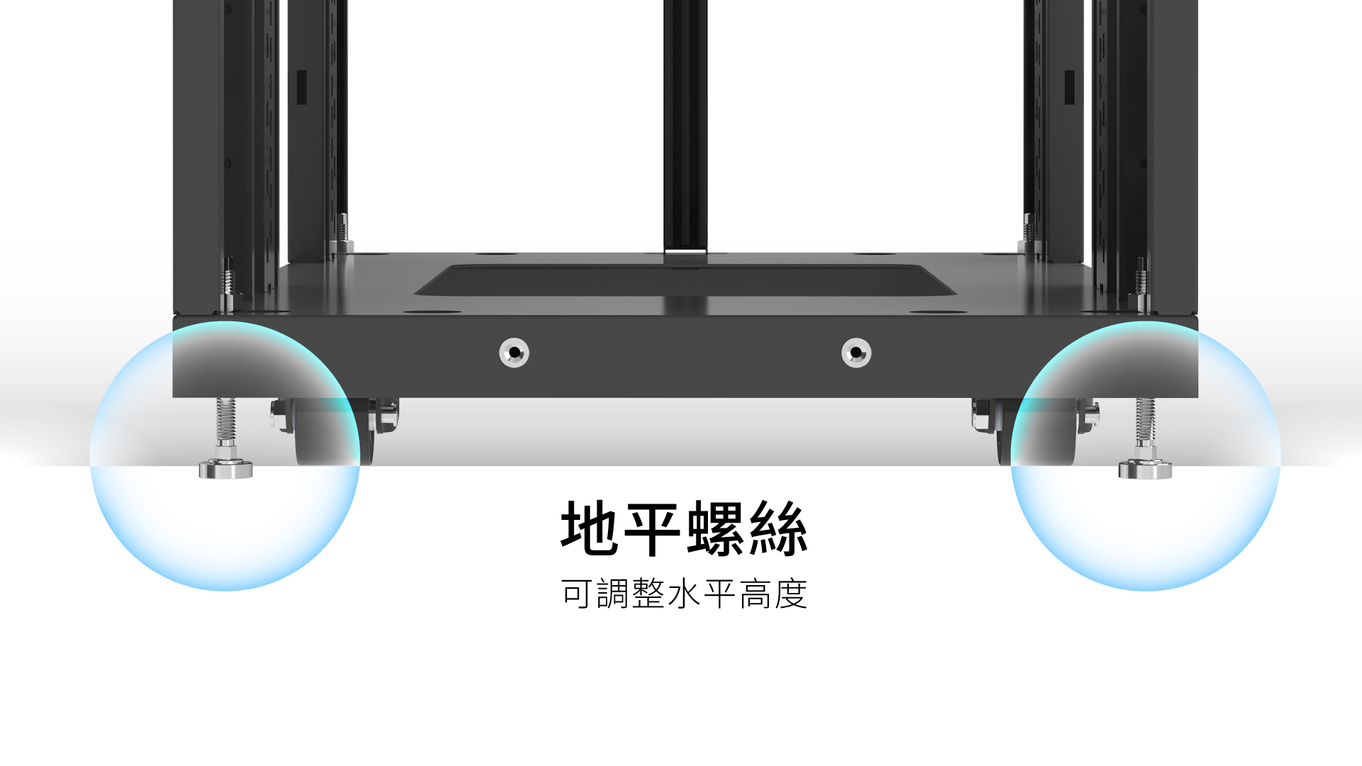 • 機櫃底部配置地平螺絲,可依現場狀況調整高度,確保穩固安裝