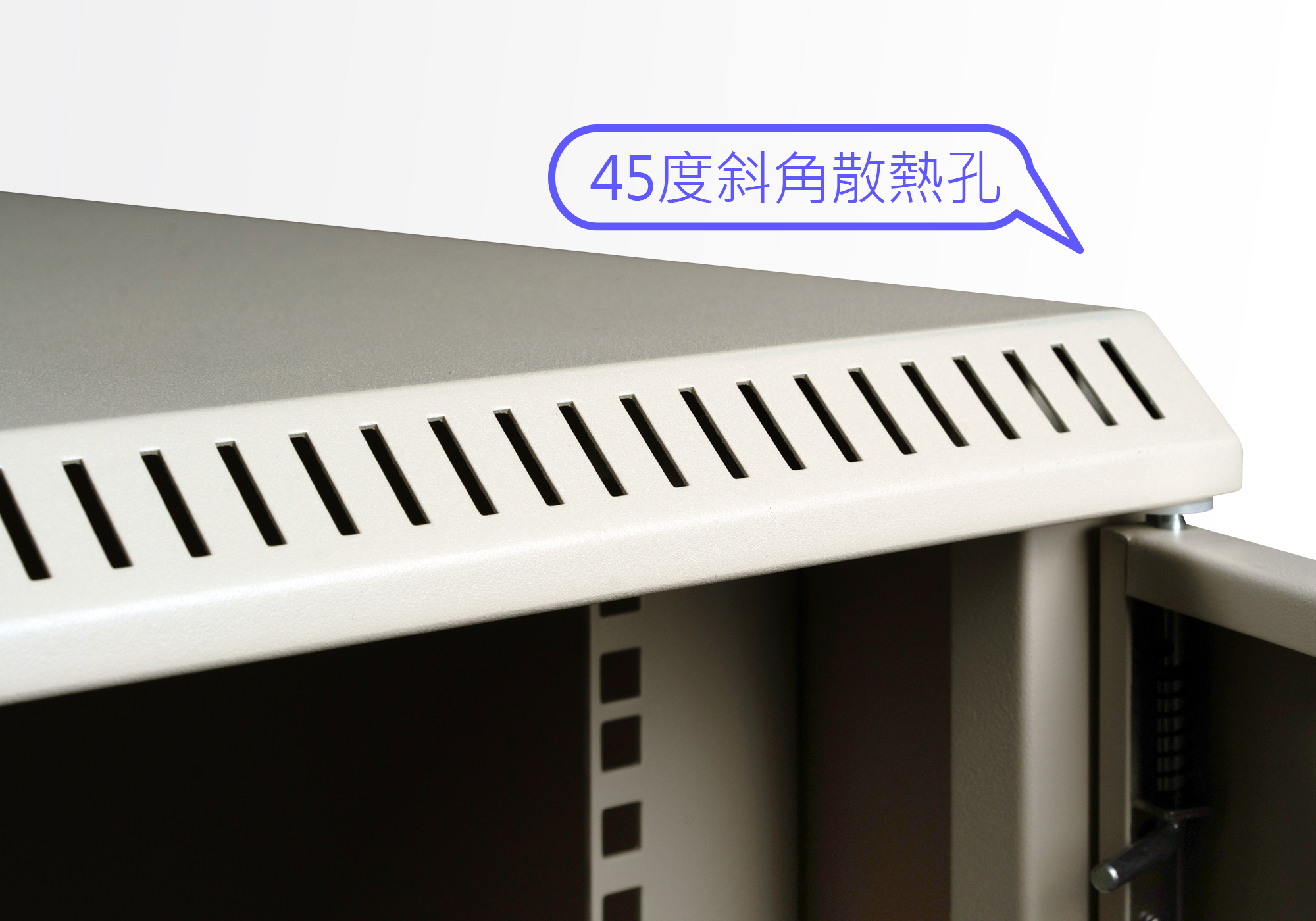 機櫃上、下前端,45度斜角散熱孔設計,兼具美觀及優良散熱對流效果。
