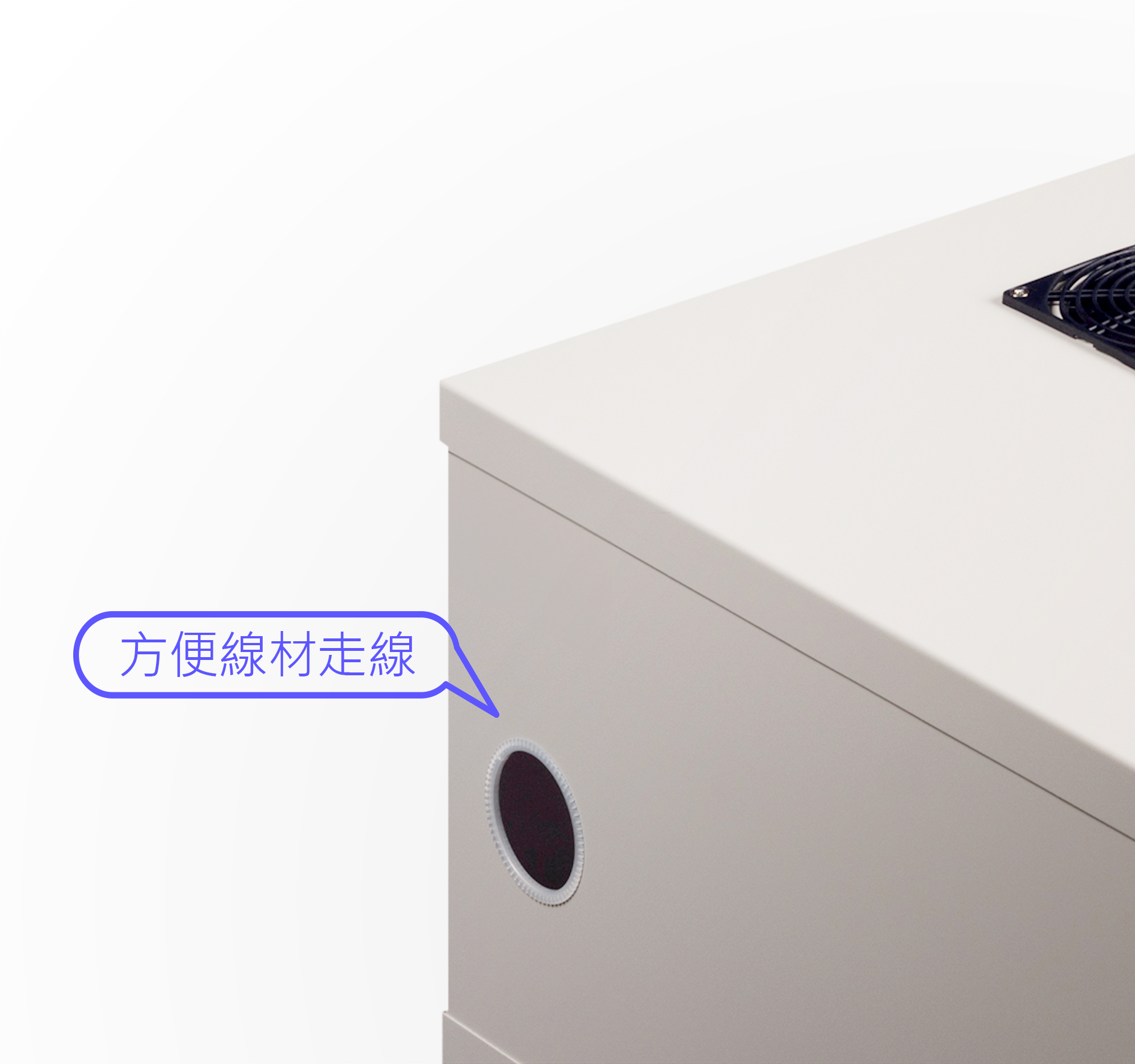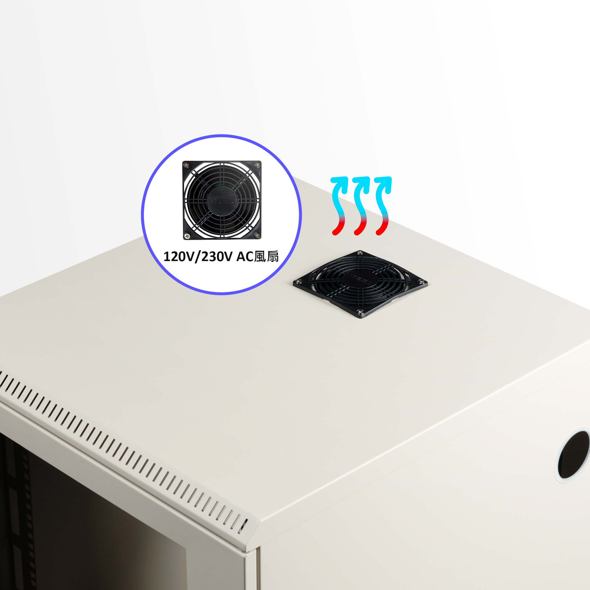 機櫃頂部有標配1顆風扇 (120V/230 V AC),加速機櫃內部散熱,避免設備當機。