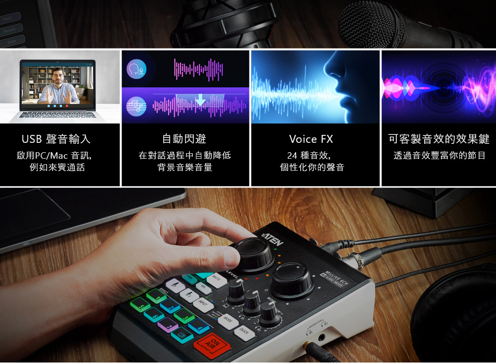 The ATEN MicLIVE AI 混音效果器 (UC8000) 整合多種功能,可解決目前播客所面臨的常見問題。