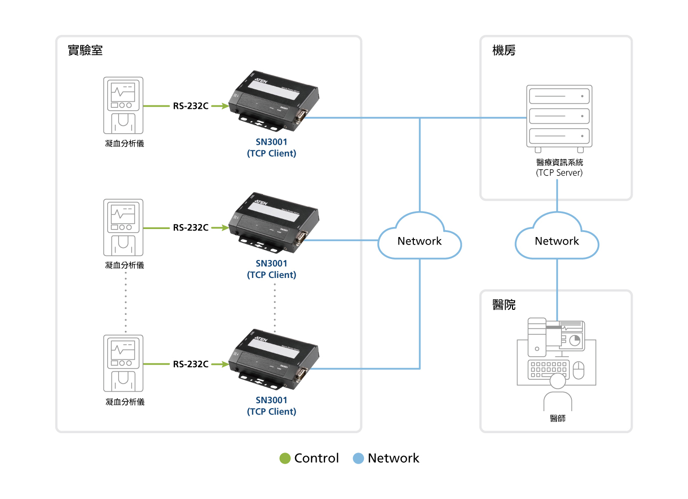 SN3001的序列轉乙太網路連接,讓設備得以放置在不同的實驗室分支機構,透過集中式電子病歷系統遠距蒐集所有數據並進行分析