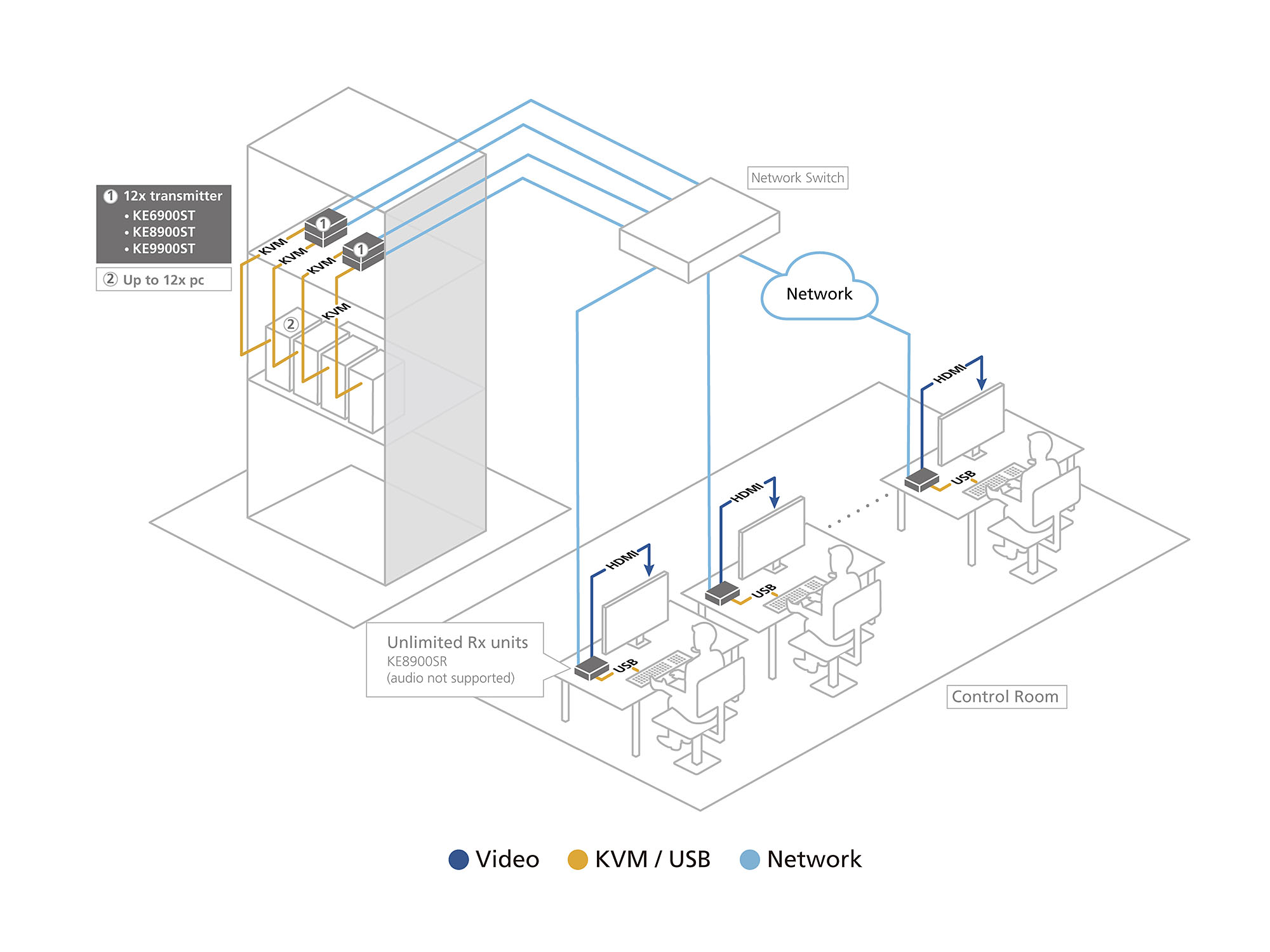 The ATEN KVM over IP Matrix System combines KVM over IP Extenders with KVM over IP Matrix Manager (CCKM) to extend, control, monitor and access DisplayPort/HDMI/DVI-interfaced computers across an independent network with flexible configurations. Over IP solutions allow operators to be separated from servers, while secure, remote access is made easy, and servers remain centrally manageable.