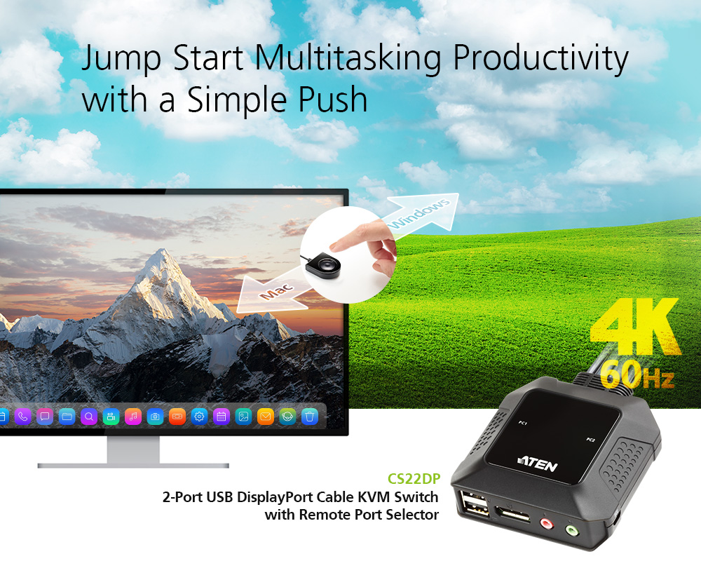 The CS22DP Cable KVM Switch allows for an ideal desktop setup in office, media design work and entertainment.