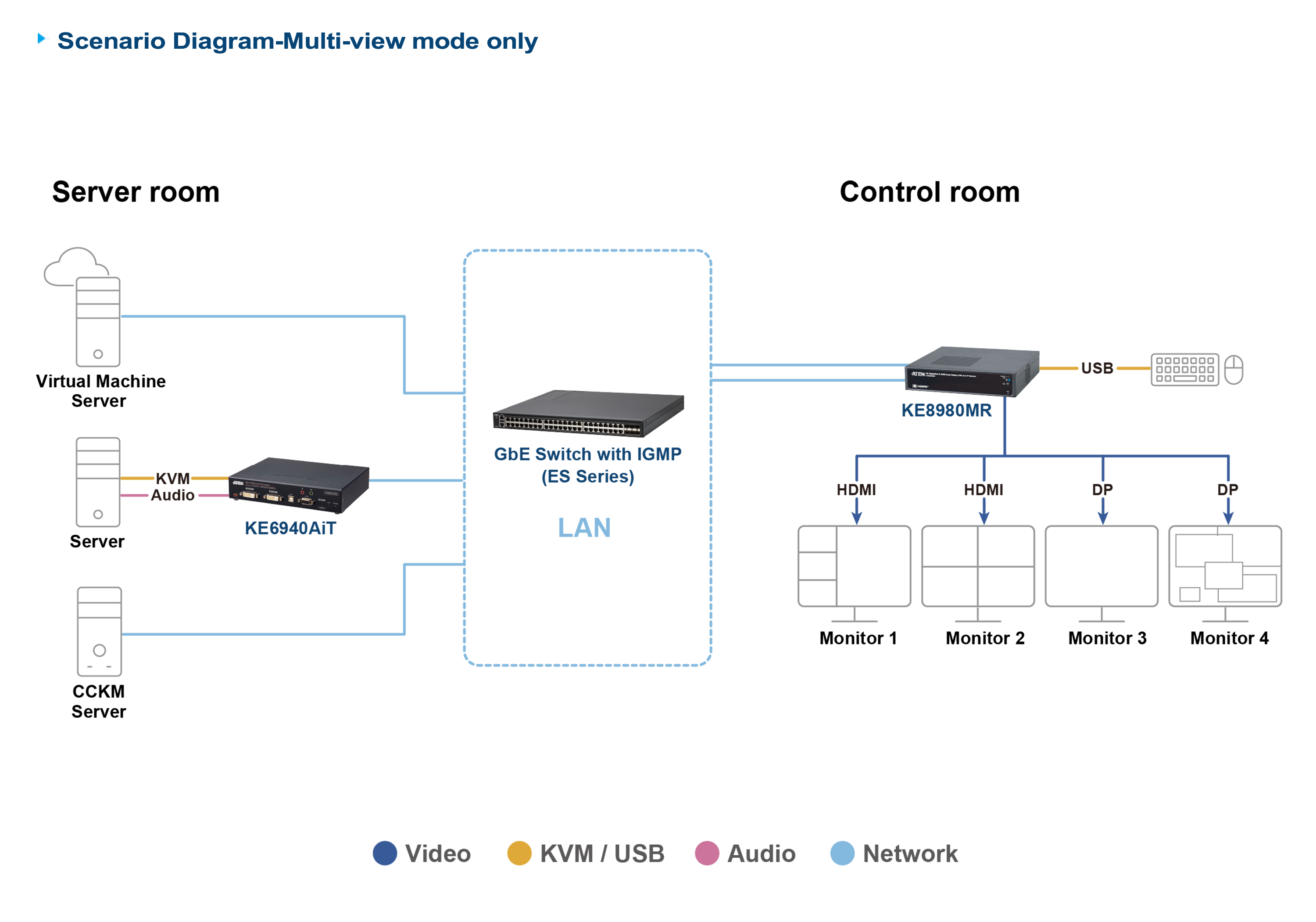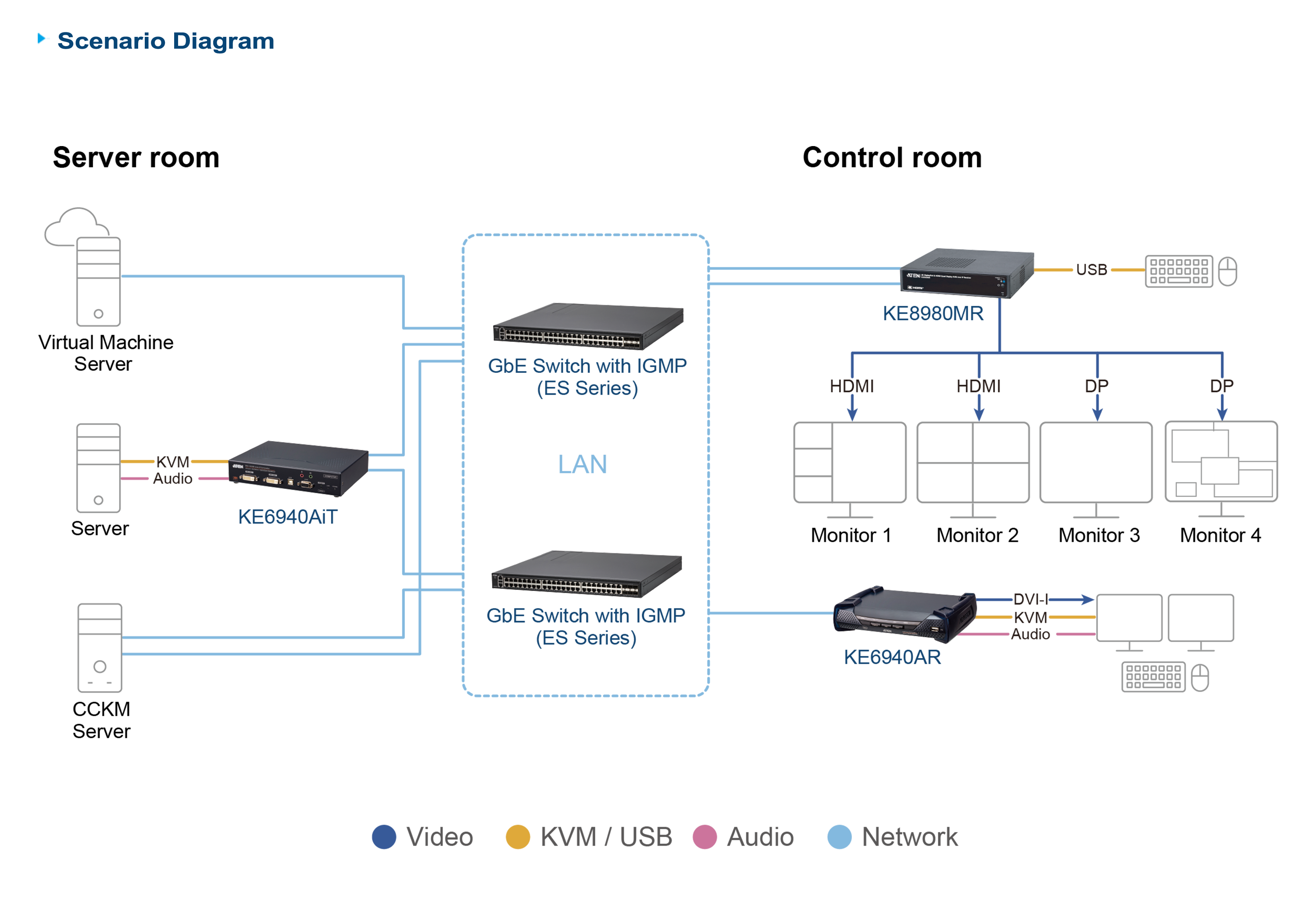 Built for ultimate flexibility, the KE8980MR excels in dynamic IT infrastructures with transmitter-receiver connections in a matrix configuration, enabling highly adaptable deployments. As part of the scalable KVM over IP Matrix System, it empowers operators with real-time monitoring and boundless switching between physical servers connected via KE series KVM over IP transmitters and virtual machines – all effortlessly managed through ATEN’s intuitive CCKM system.