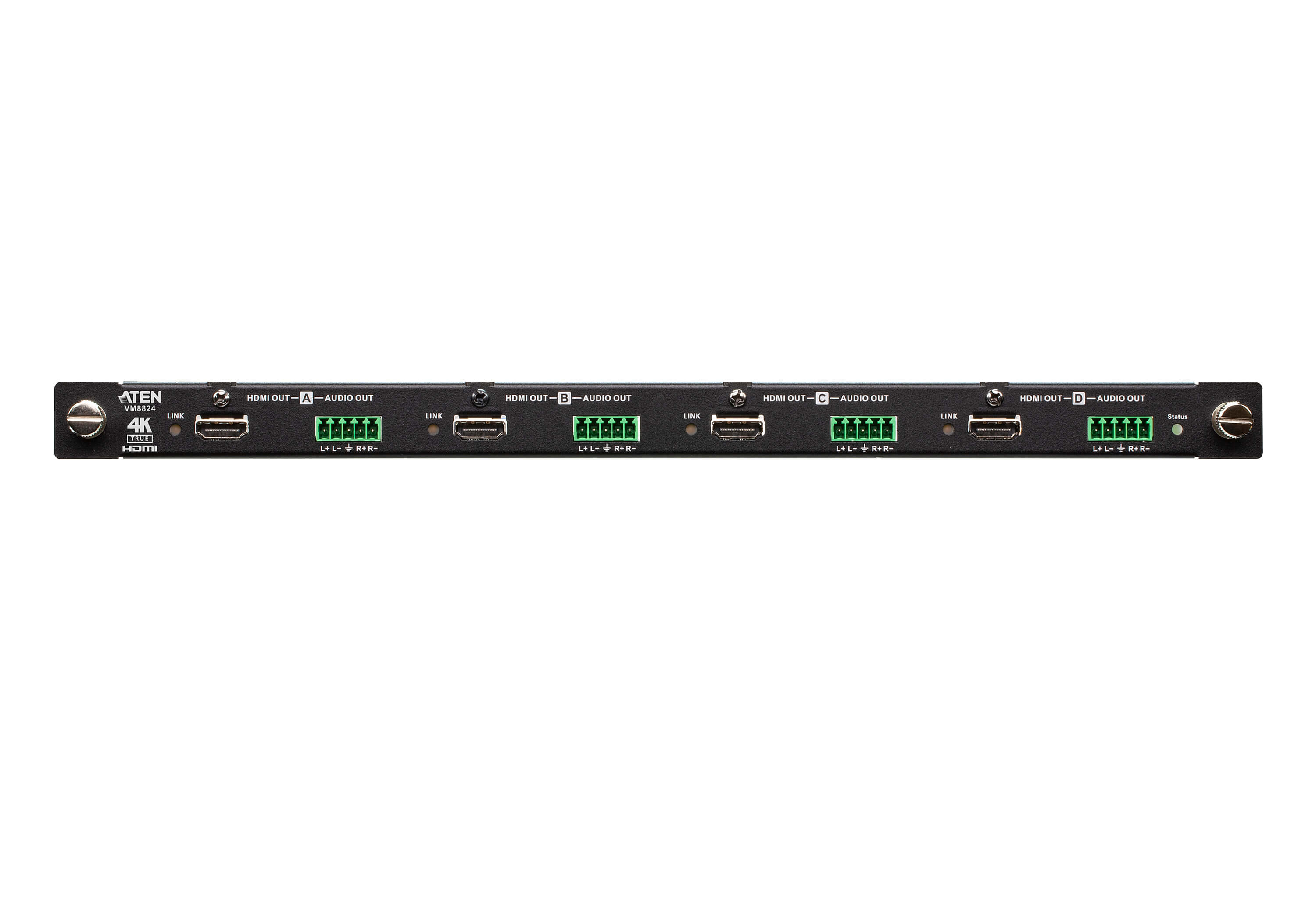 The VM8824 is a True 4K HDMI output board that works with an ATEN Modular Matrix Switch to offer an easy way to route 4 analog/digital audio/video sources to 4 HDMI displays with True 4K high-definition images support. In addition to the HDMI interface that carries digital A/V signal, the VM8824 also provides 4 stereo audio output ports that enable HDMI audio extraction.