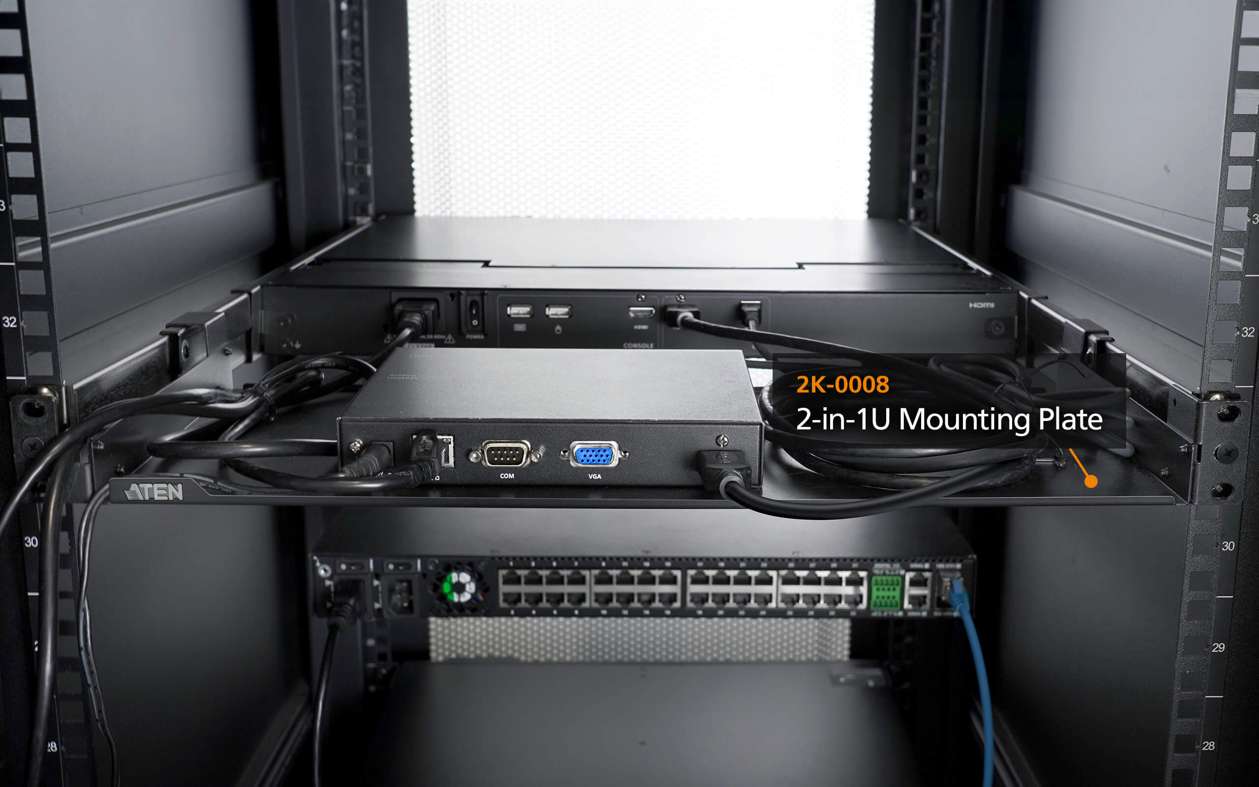 ATEN’s 2K-0008 2-in-1U Mounting Plate provides a flexible mounting solution that works with 2K-0001 or 2K-0002, which combines an LCD KVM console with a console station or KVM over IP extender in a 1U rack space*. This plate maximizes space and simplifies maintenance, delivering a clean, organized, and highly efficient solution.