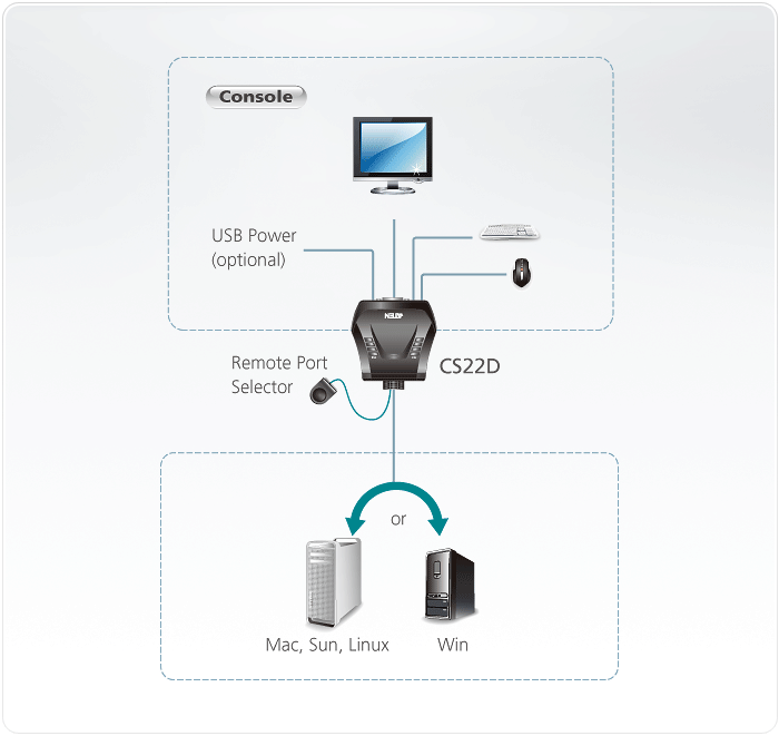 The CS22D 2-Port USB DVI KVM Switch is a control unit that allows access to two computers from a single USB and DVI console (keyboard, video and mouse). With the CS22D, you can access the computers conveniently via a Remote Port Selector.