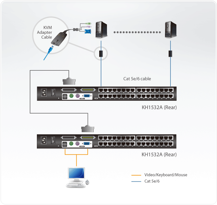- By daisy chaining up to 31 additional KH1532A switches, as many as 1024 computers can be controlled from the original KVM console