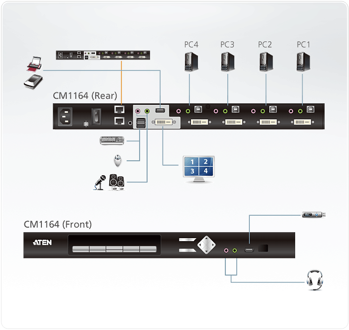 With its unique design and innovative features, the CM1164 4-port USB DVI-D KVMP Control Center is the right solution for a wide range of practical applications, including control rooms, monitoring systems, and traffic control centers – allowing you to switch seamlessly between four DVI-enabled PCs, and share USB peripherals and audio from a multi-view console.