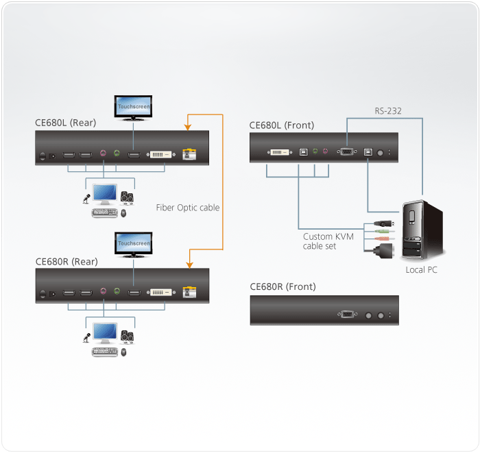 The CE680 allows access to a computer from both the local and remote consoles (USB keyboard, monitor, and mouse). Furthermore, the CE680 takes advantage of the newest fiber optic cable technology to connect the local and remote units; providing easy installation and a very long 0.4 miles (600 m) extension of KVM DVI signals.