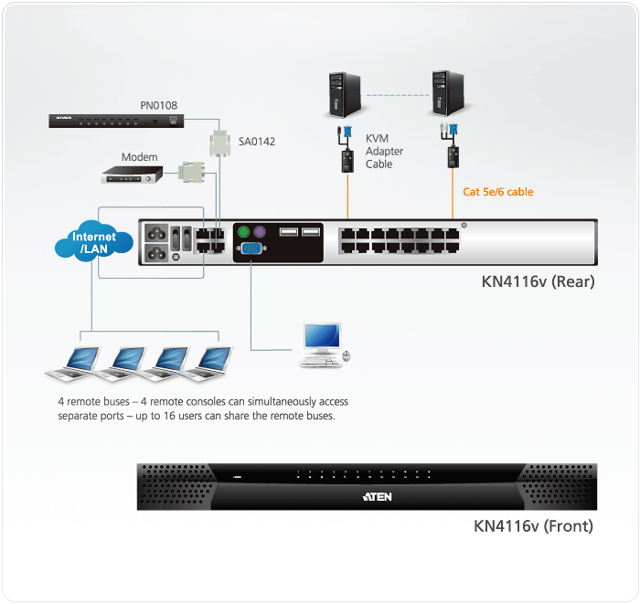 Aten´s new generation of KVM over IP switches - KN series allows local console access and remote over IP access for operators to monitor and access their entire data center over a network using a web-based browser. In addition, they offer out-of-band access with external modem support for BIOS-level troubleshooting when the network is down.