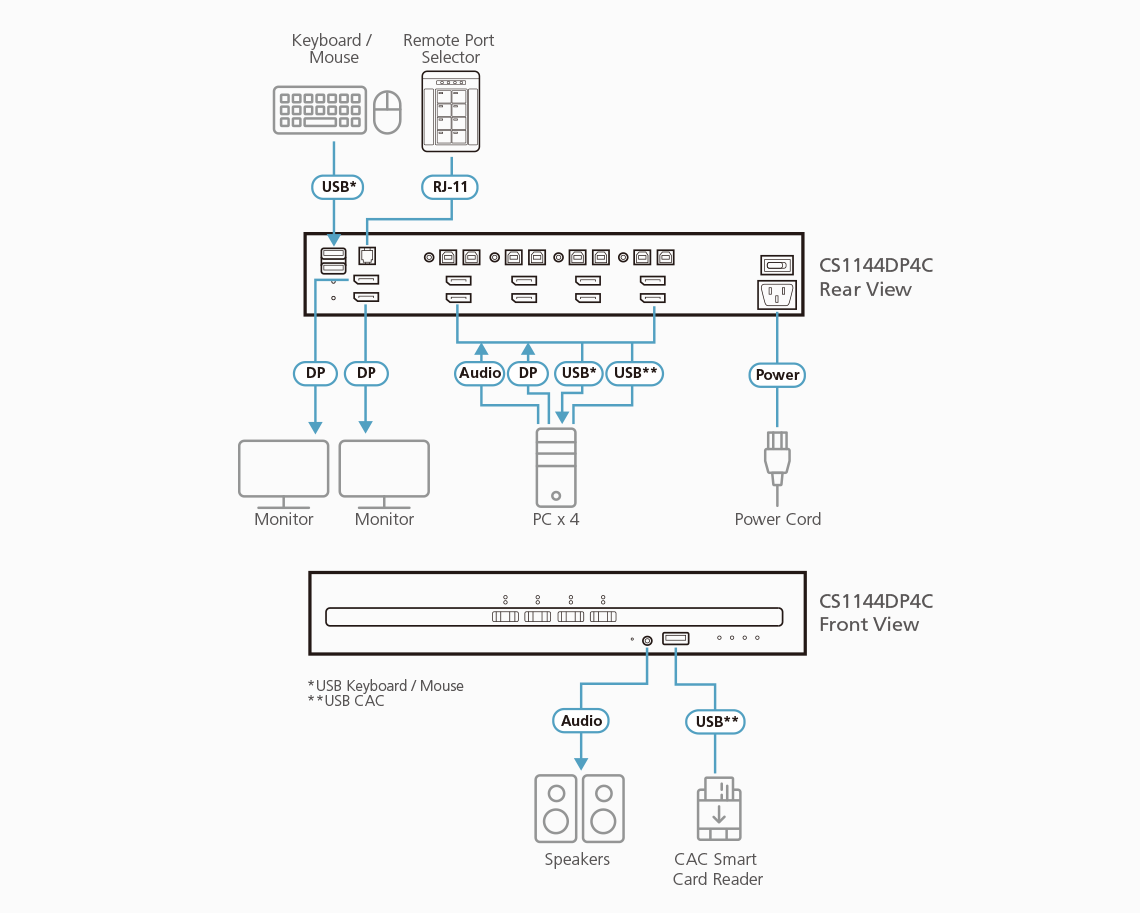 - 1x CS1144DP4C 4-Port USB DisplayPort Dual Display Secure KVM Switch with CAC