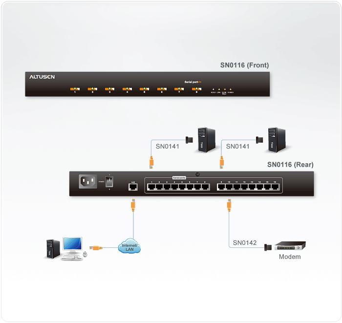The ALTUSEN SN series of serial console servers integrate cutting Features edge technologies with secure enterprise communications. Available in 16-port models, the serial console server offers both in-band and out-of-band remote serial console access to servers and network devices, via a direct Telnet/SSH client or an applet viewer. SN works in tandem with the ALTUSEN Power Over the NET™remote power management system. Both can be managed with CC2000 management software to provide centralized data center management and integrated power management. With their comprehensive features, SN series of serial console servers help maximize IT productivity, provide scalability and reduce operational costs.