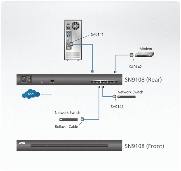 The SN Series of Serial Console Servers integrates cutting edge technology to provide secure serial device access and management for data centers. Available in 8 port models, the Serial Console Servers offer both in-band and out-of-band remote serial console access to servers and network devices via a direct Telnet/SSH client and applet viewer. SN Serial Console Servers work in tandem with ATEN’s Power Over the NET™ remote power management systems. Both can be utilized through ATEN’s CC2000 software to provide centralized serial device access and integrated power management. With its comprehensive features, the SN Series of Serial Console Servers help to maximize IT productivity, increase scalability and reduce operational costs with easy remote management of serial devices.