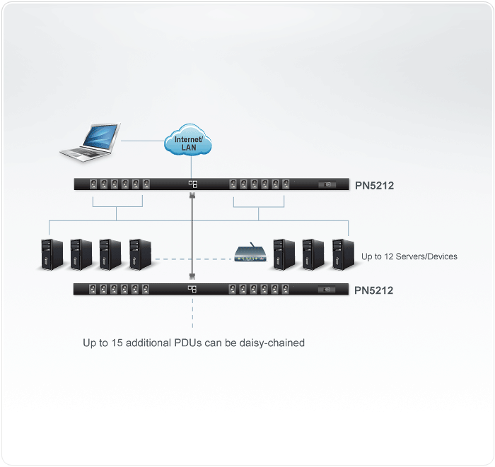The PN5212 can be daisy-chained to manage even more devices, so your server room management can expand in step with your company's growth. For ease of management, when PDUs are deployed in conjunction with other ALTUSEN products*, administrators can access them all from the same user interface. When a PDU is integrated in a CC (Control Center Over the NET™) management software installation, the power outlet of an IT device can be associated with its KVM port and displayed on the same CC web page. This allows IT administrators to completely control an IT device from a single user interface.