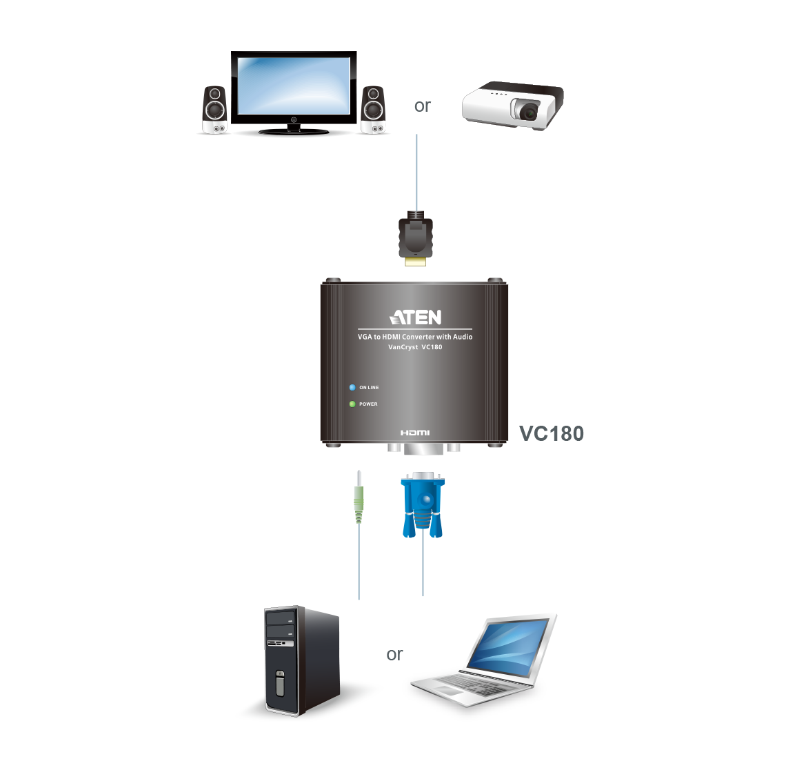 The VC180 converts VGA video to HDMI digital video to connect your computer to monitors, projectors, or Televisions.