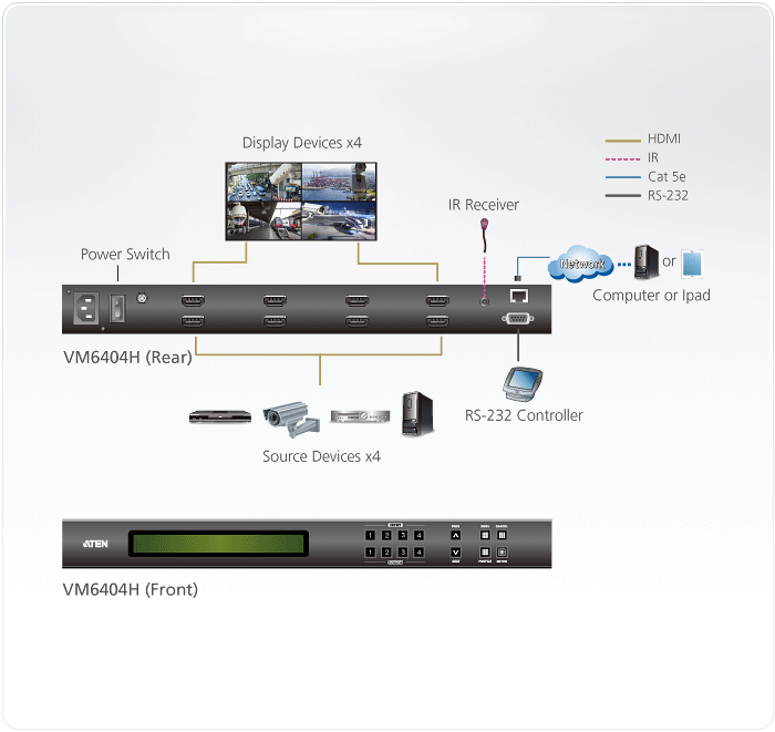 The VM6404H is an ideal solution for applications that require multiple HDMI displays with multiple HDMI sources to be conveniently setup – such as for stage presentations, digital classroom, video conference rooms and any installation that requires real-time reporting.